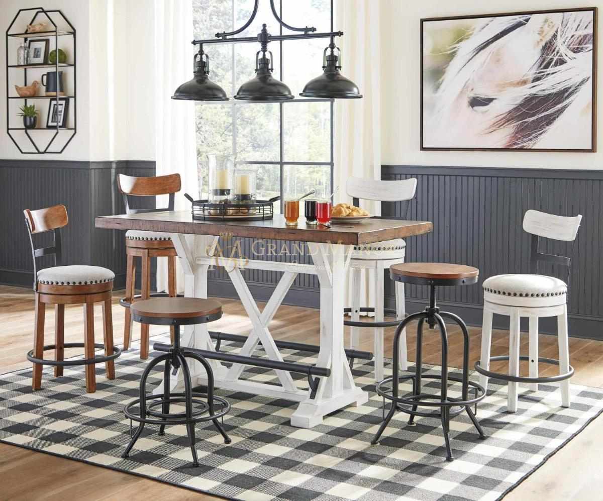 Этот обеденный стол, высота которого сравнима с барной стойкой, станет изысканным выбором для небольших помещений. Он идеально подойдёт для деревенского стиля загородного дома.