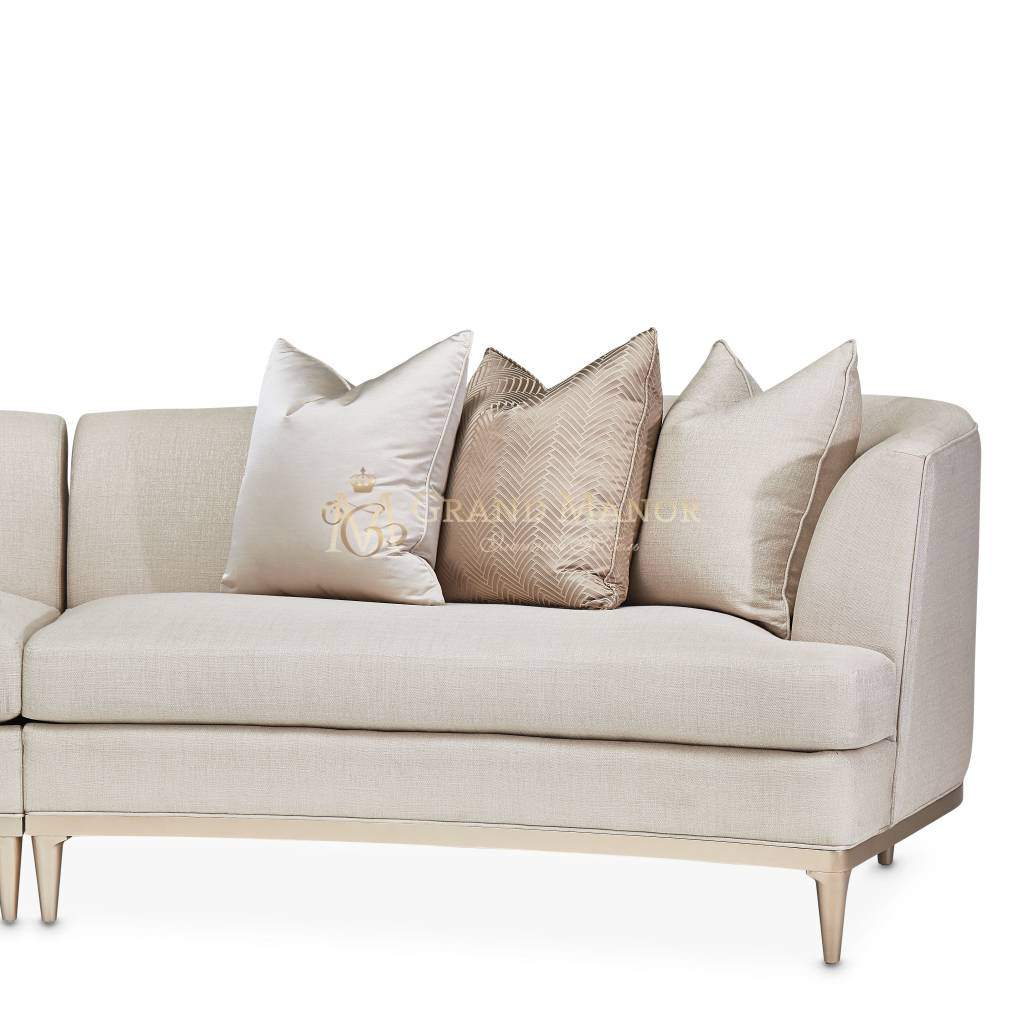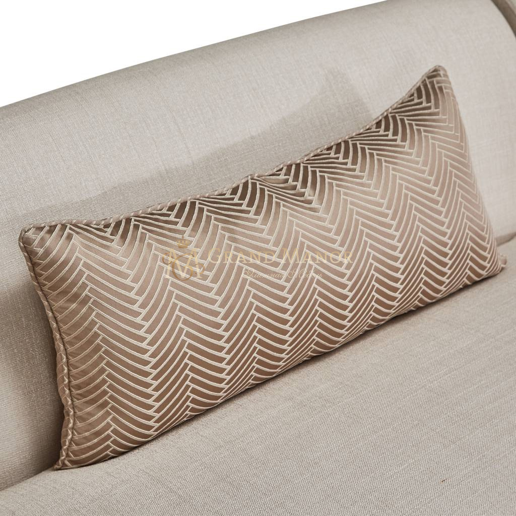 Диван обит матовым льном жемчужного цвета.