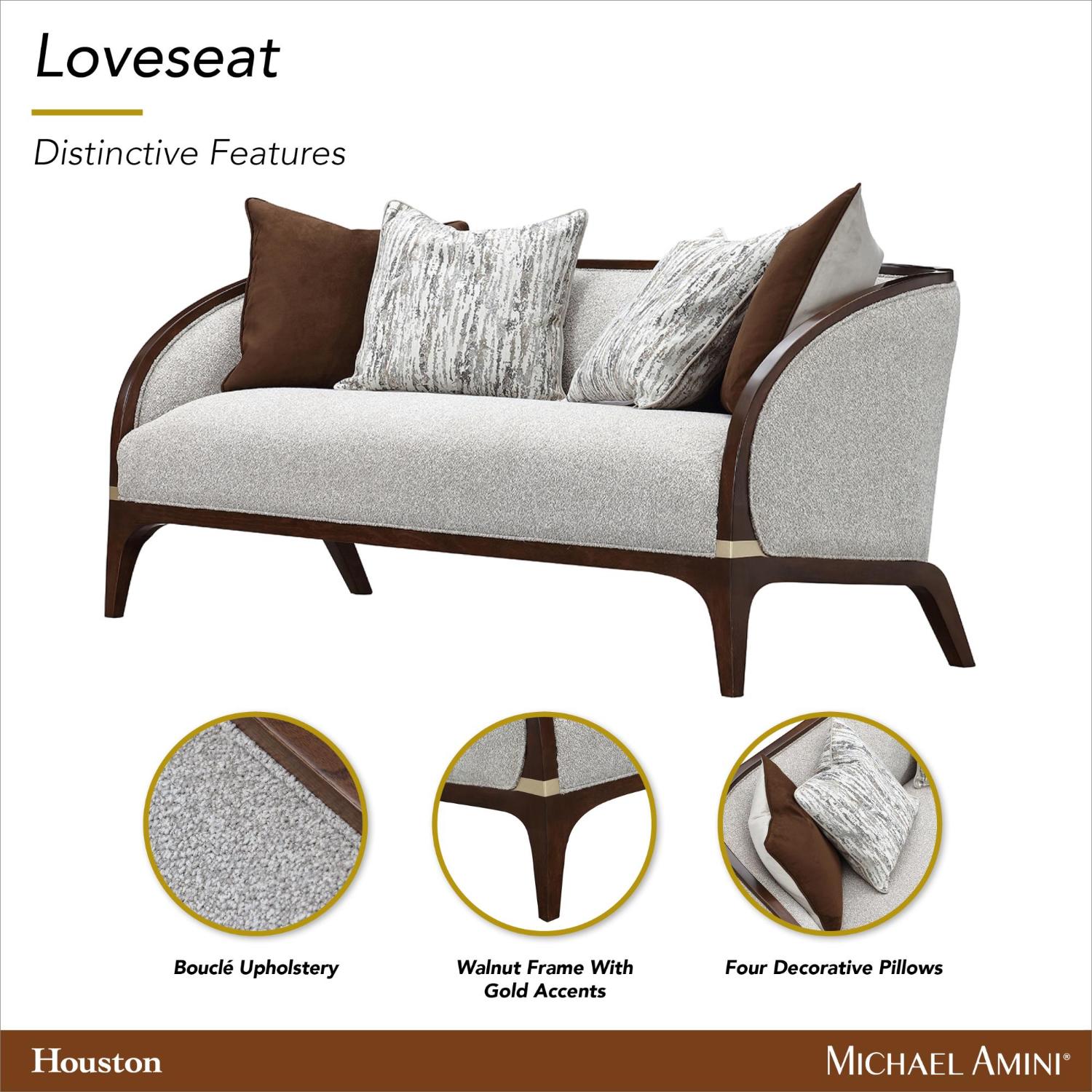 Двухместный диван Houston — это удивительное сочетание изысканной элегантности и современного комфорта. Его обивка выполнена из смеси тканей букле в нежных оттенках серого, слоновой кости и коричневого, что придает дивану утонченный и привлекательный вид.