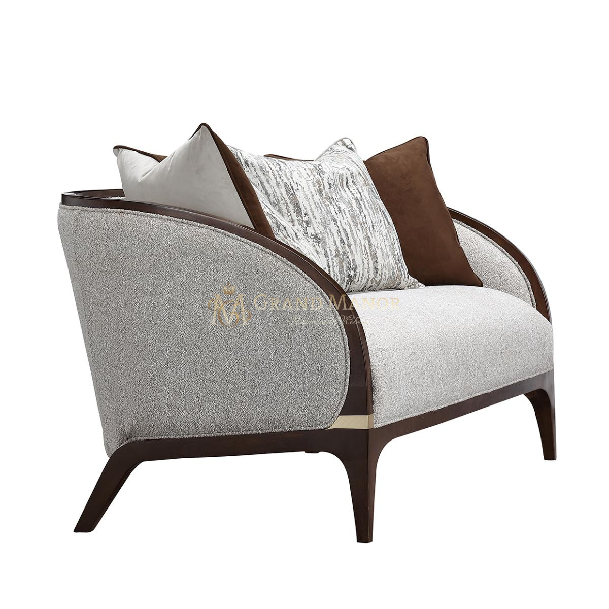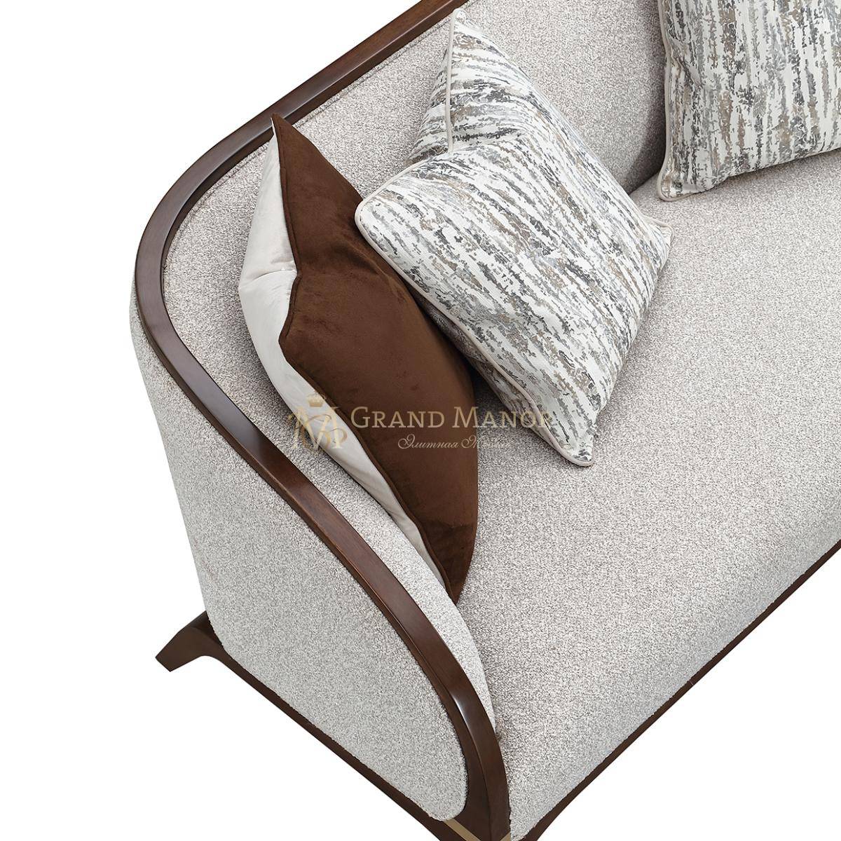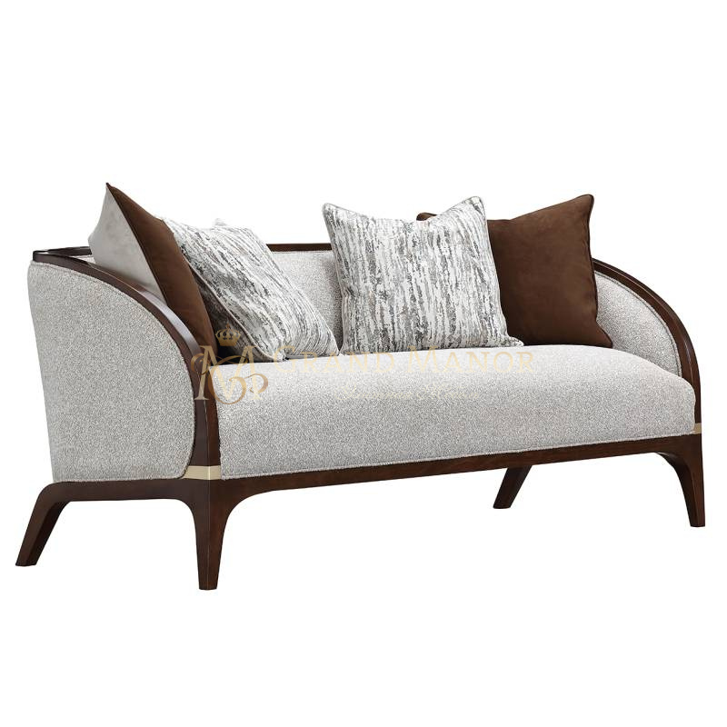 Деревянная рама, отделанная орехом, украшена золотистыми деталями, что добавляет ему легкий оттенок шика. Этот диванчик создан как для стиля, так и для отдыха, с тщательно подобранной коллекцией подушек с пуховым наполнителем, которые дополняют его роскошную привлекательность.