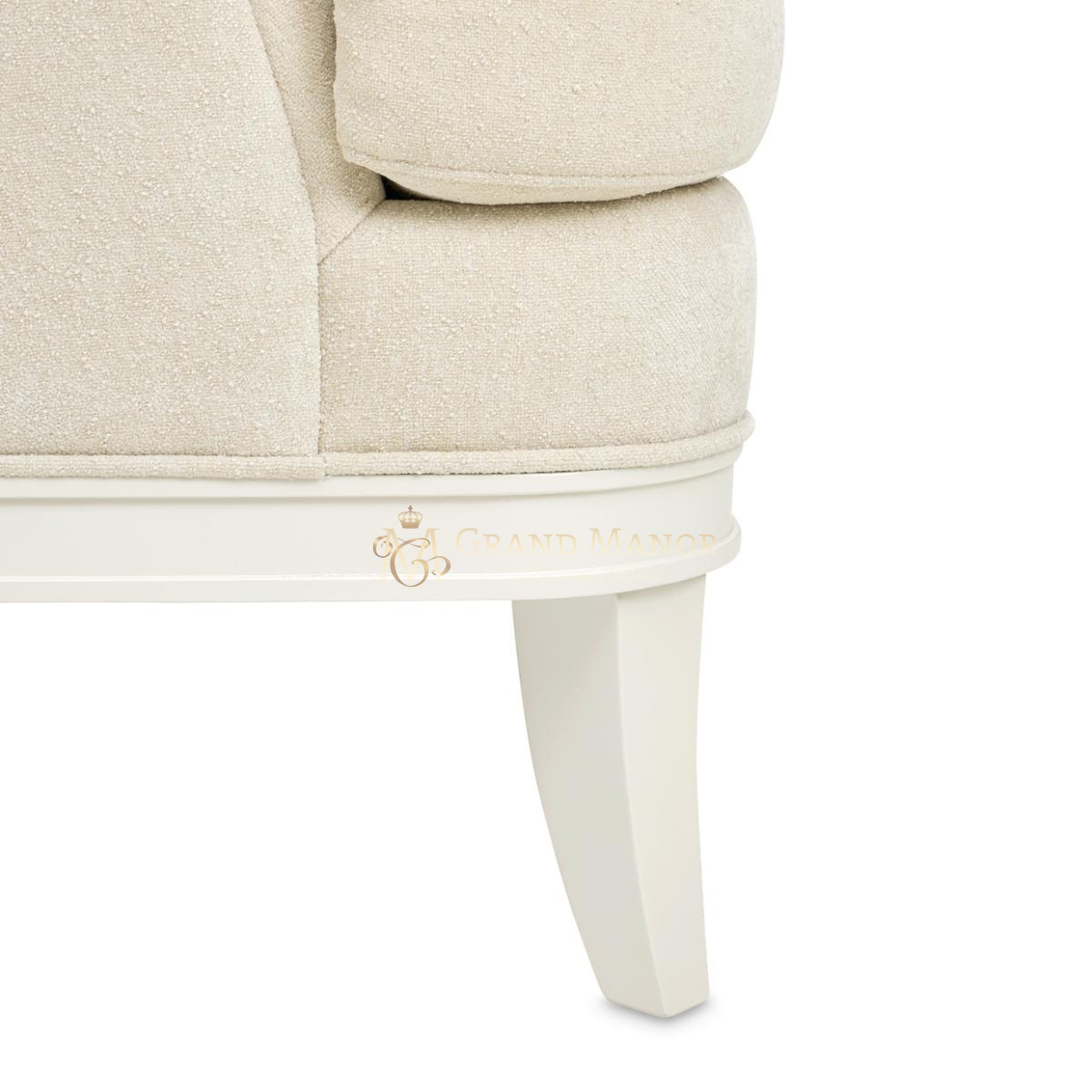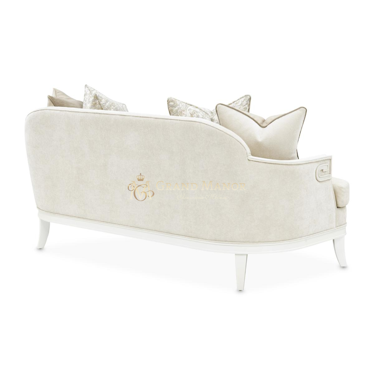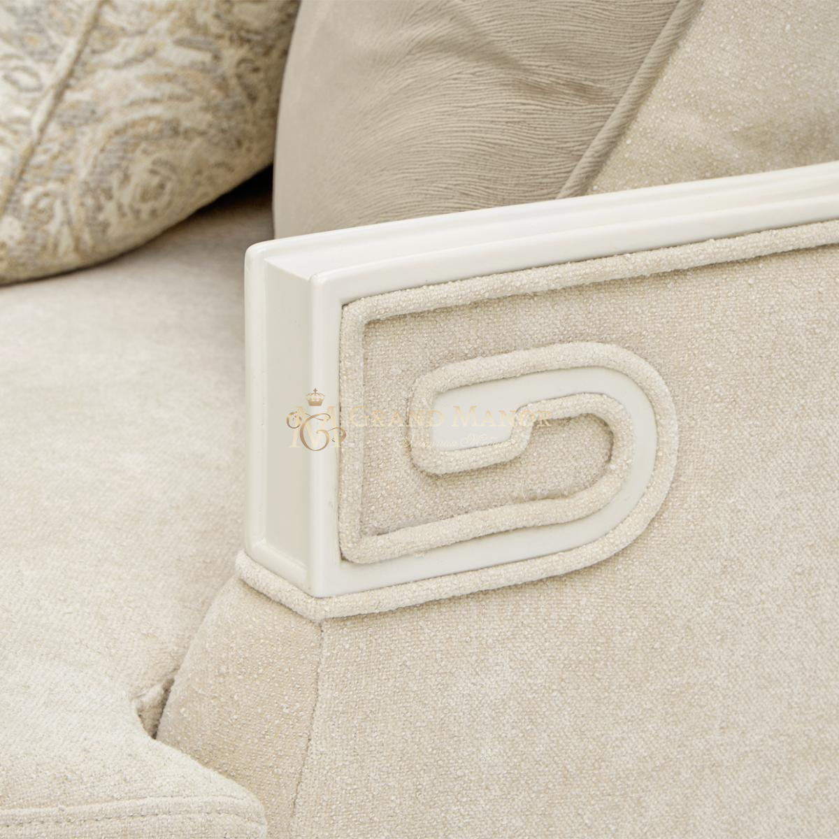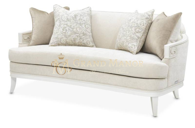 Мягкий, нейтрального оттенка диван, обтянутый плюшевой шенилловой тканью, подчеркивает изящество силуэта, а тонкая отделка по швам придает ему индивидуальный оттенок. Рама, отделанная перламутром, излучает сдержанную роскошь, подчеркнутую скульптурными подлокотниками в виде завитков в греческом стиле.