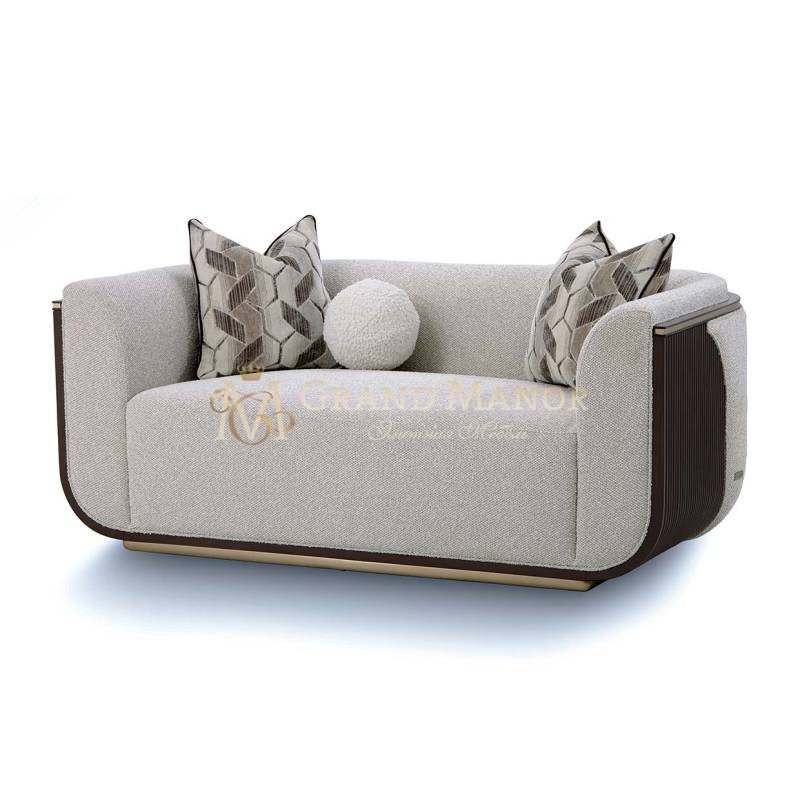 Гладкое золотое основание и изящная отделка подчеркивают изгибы диванчика, придавая ему утонченный оттенок.