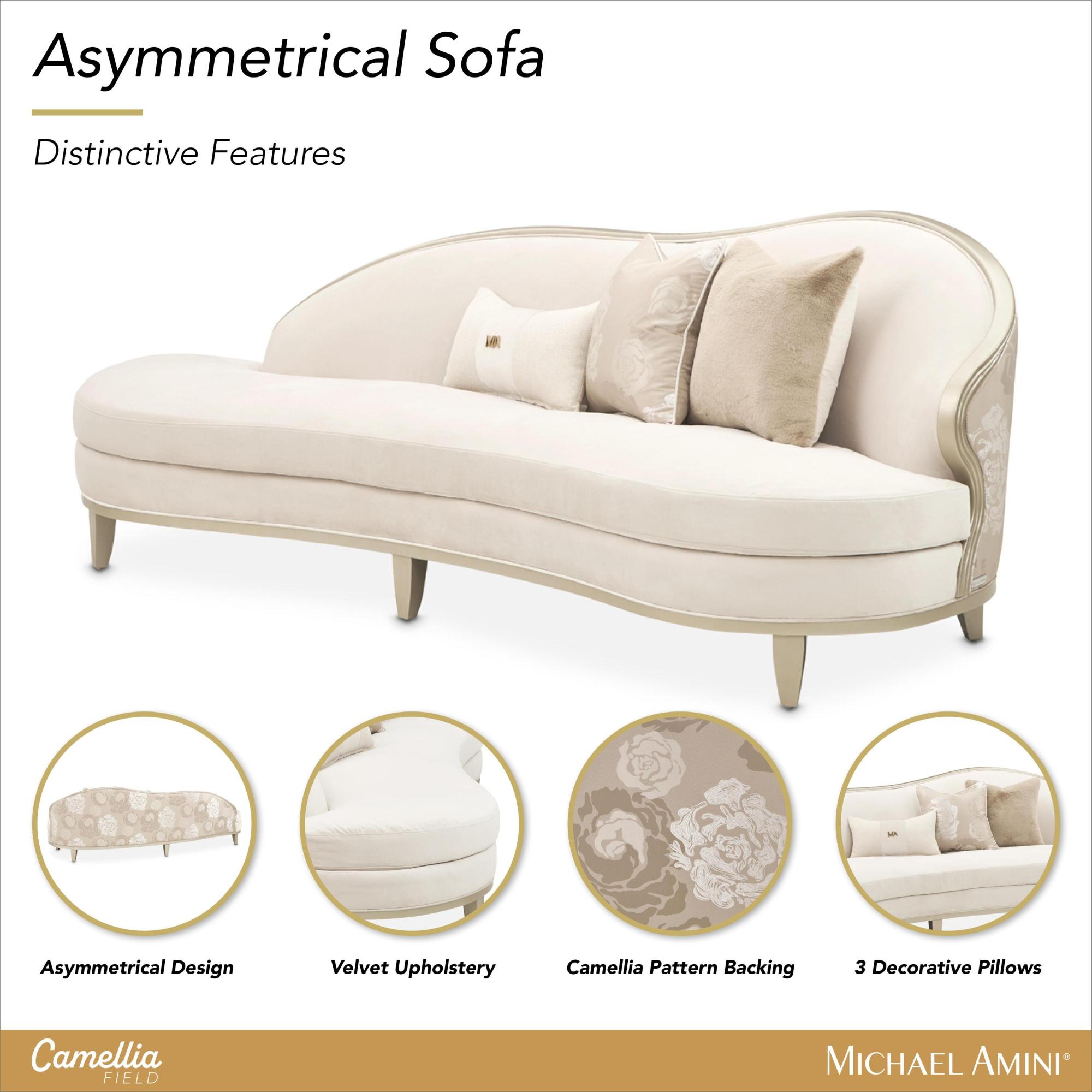 Асимметричный диван Camellia Field сочетает в себе выразительные изгибы и отголоски цветочного мастерства. Передняя часть, обтянутая мягким бархатом, создает уютное сиденье, в то время как спинка украшена ярким рисунком в виде камелии, что делает ее центральным элементом композиции.