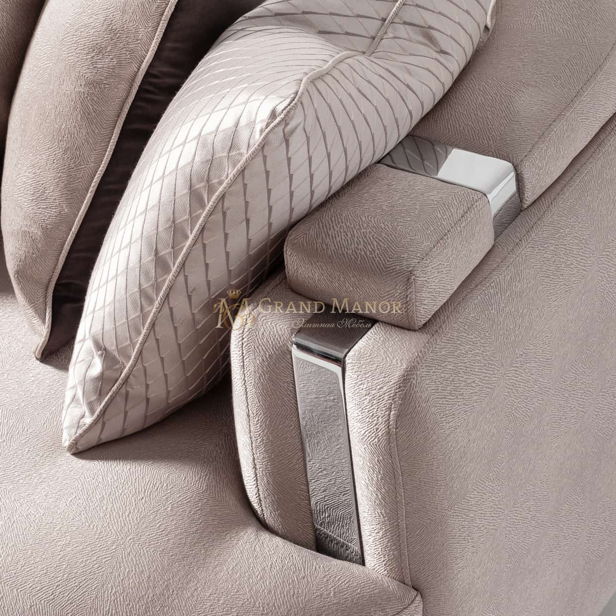 Этот величественный диван обтянут тонкой жаккардовой тканью, красиво декорирован подлокотниками из титаново-золотого металла и потрясающими декоративными подушками.
