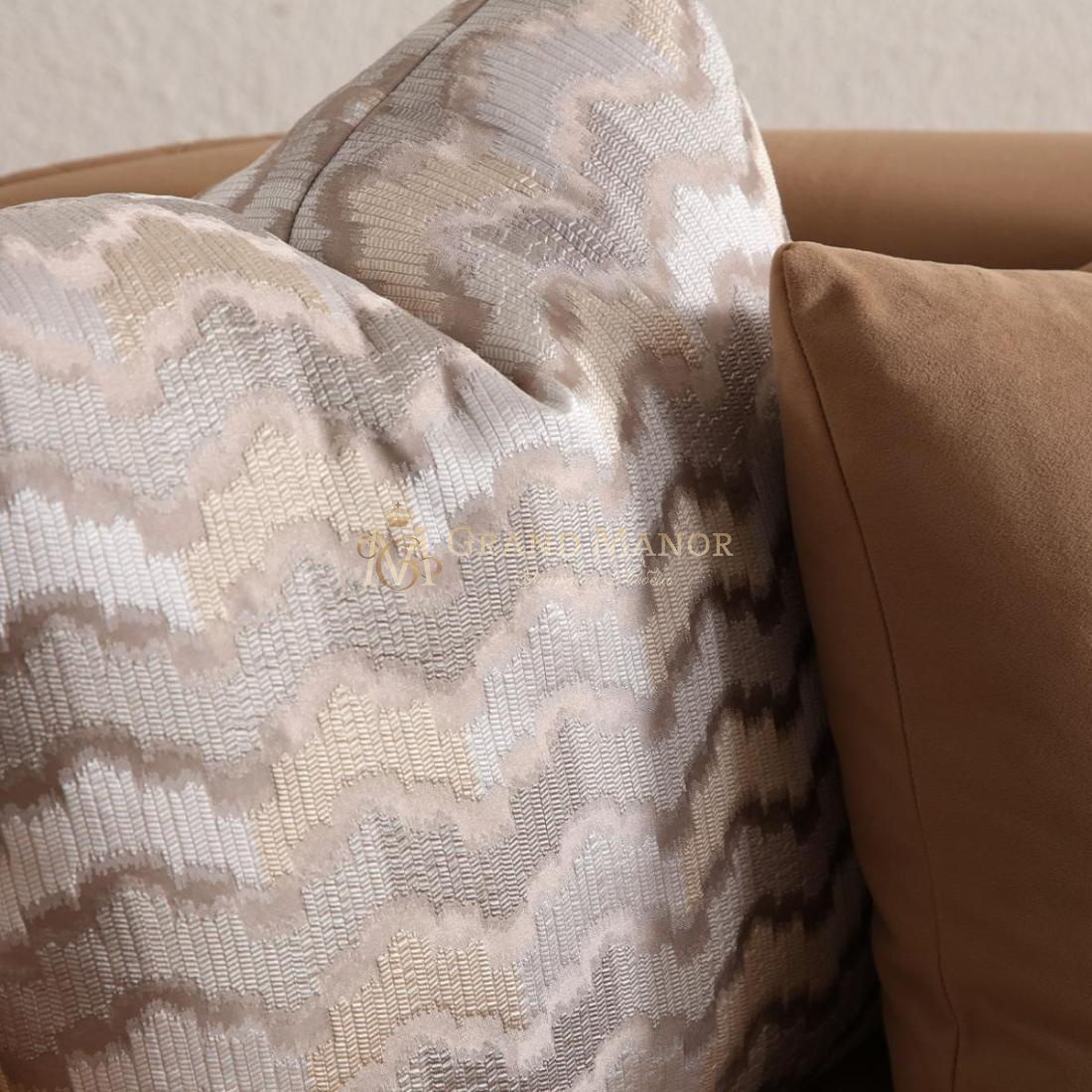 Почувствуйте роскошь с диваном Ariana, украшенным пятью оригинальными подушками, от золотистого жаккарда до роскошного бежевого бархата, каждая из которых обогащает обстановку, создавая роскошную атмосферу для отдыха в вашем жилом пространстве.
