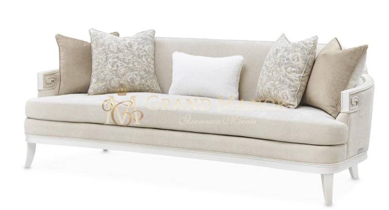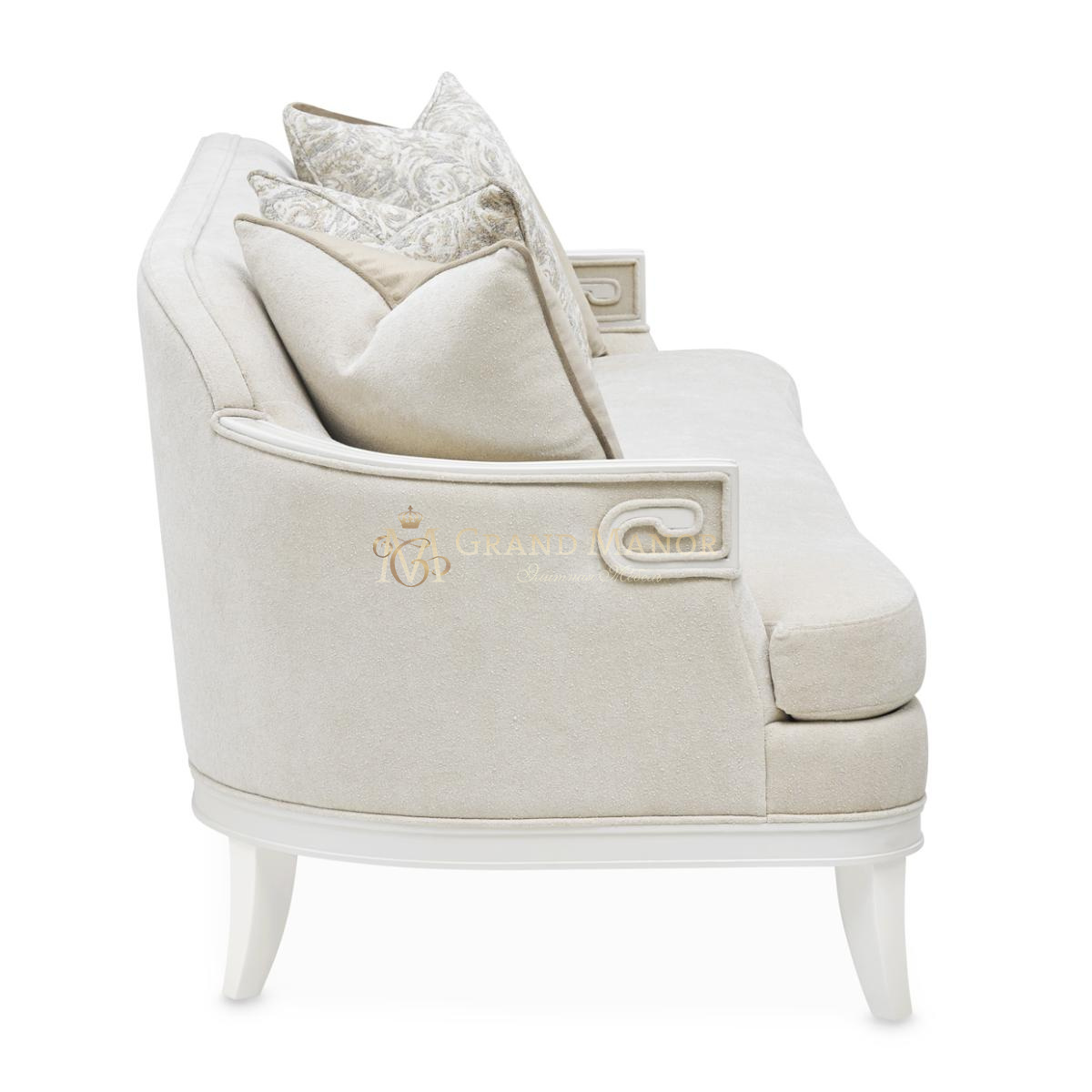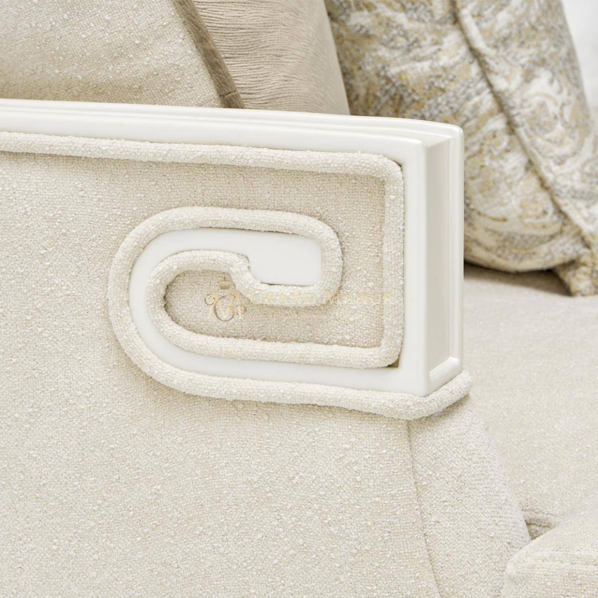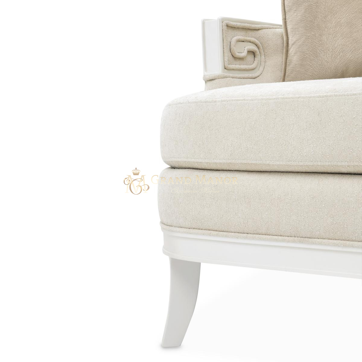 Мягкая обивка из плюшевого шенилла нейтрального оттенка подчеркивает утонченный силуэт дивана, а тщательная обработка швов подчеркивает каждый изгиб. Жемчужная рама, излучает сдержанную роскошь, дополненную деталями в виде завитков на подлокотниках в стиле греческого ключа.