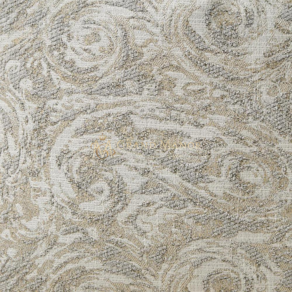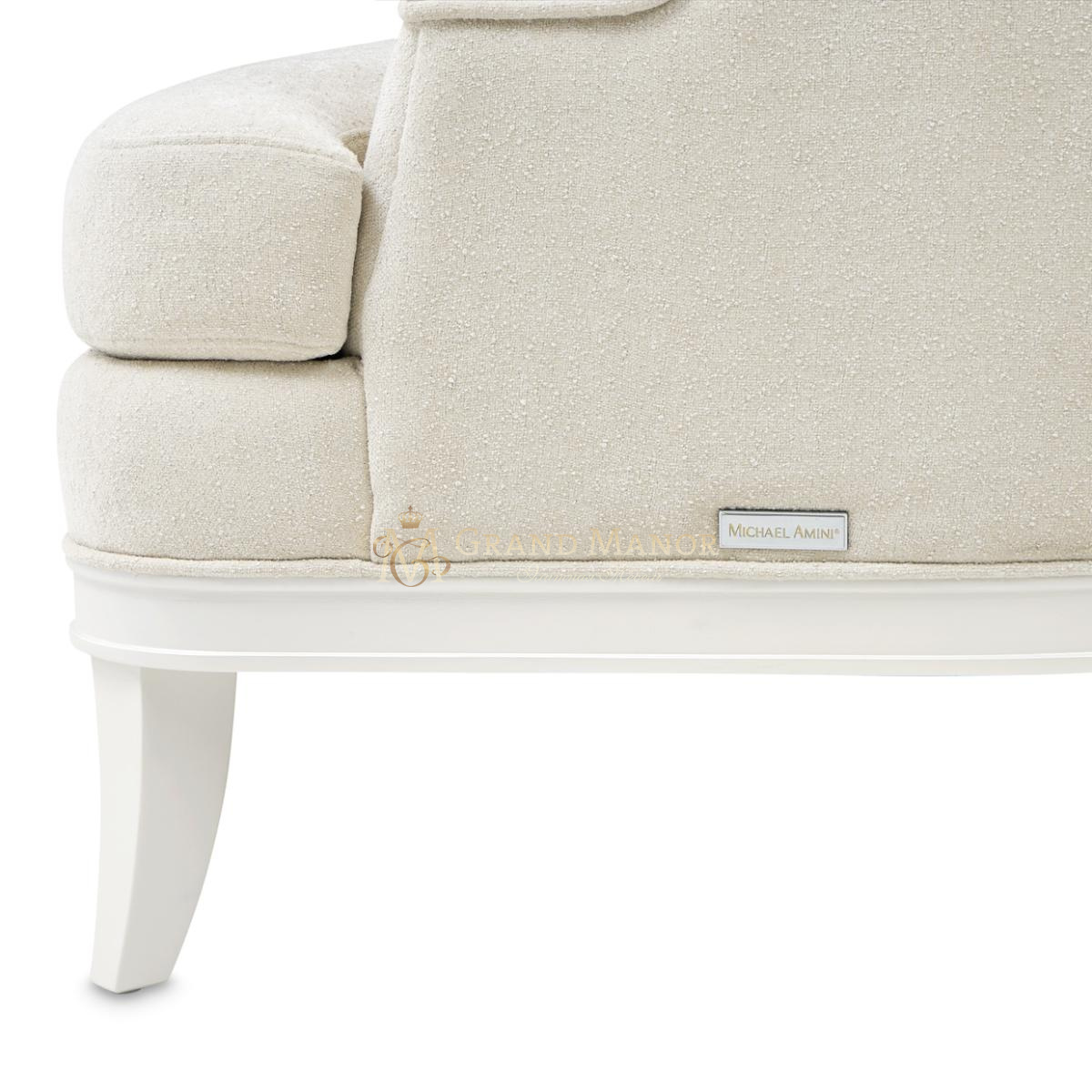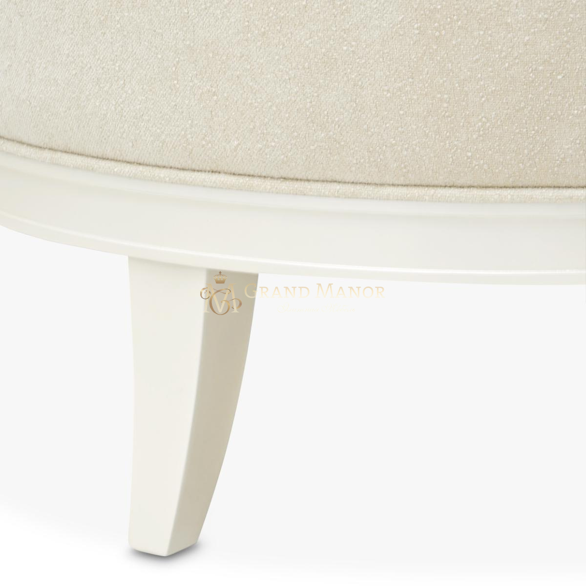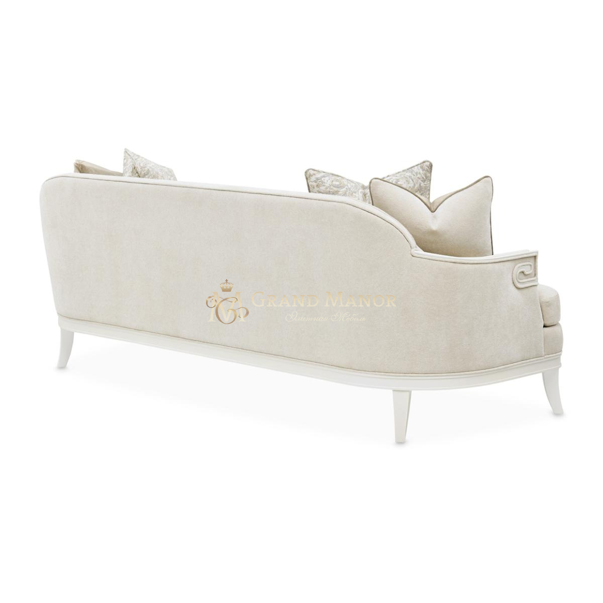 Мягкая обивка из плюшевого шенилла нейтрального оттенка подчеркивает утонченный силуэт дивана, а тщательная обработка швов подчеркивает каждый изгиб. Жемчужная рама, излучает сдержанную роскошь, дополненную деталями в виде завитков на подлокотниках в стиле греческого ключа.