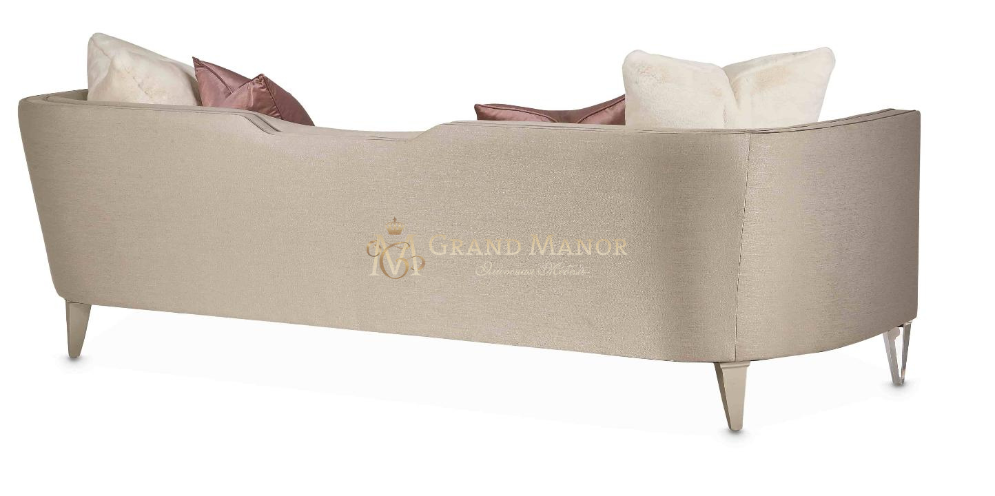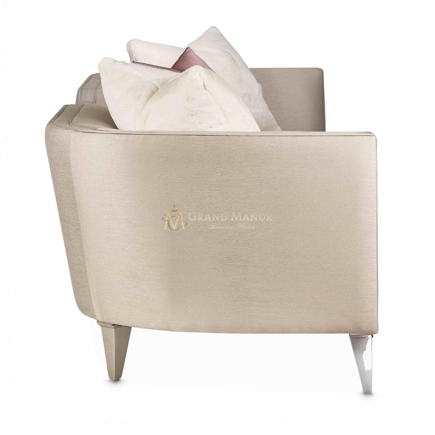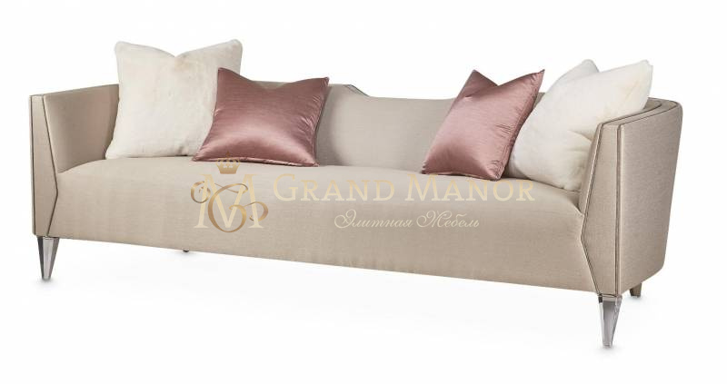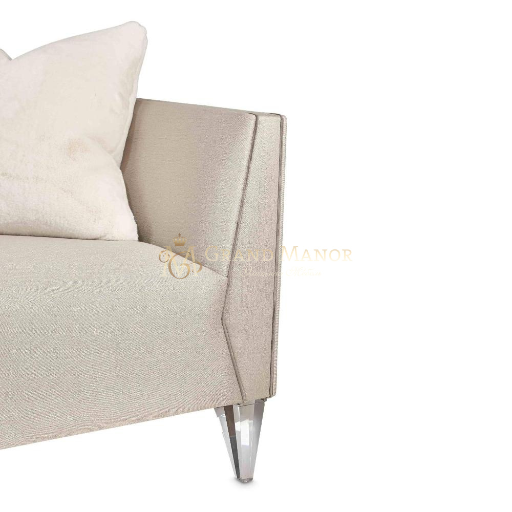 Отделанный серым бархатным рантом, блестящими акриловыми ножками и прекрасным набором нейтральных подушек, этот диван готов украсить ваше жилое пространство.