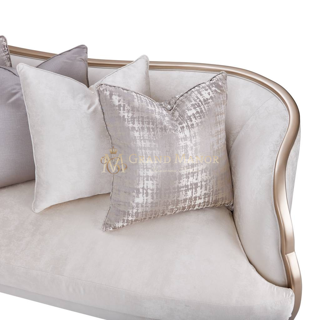 Диван обит мраморным жаккардом в облачно-белом цвете.
