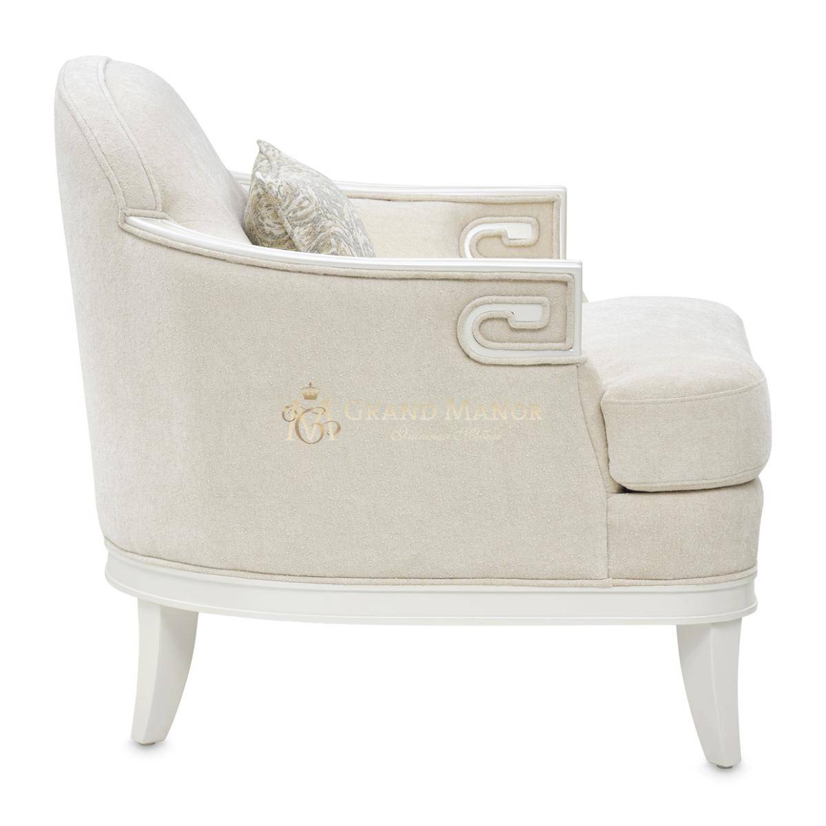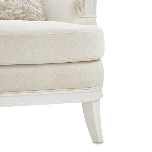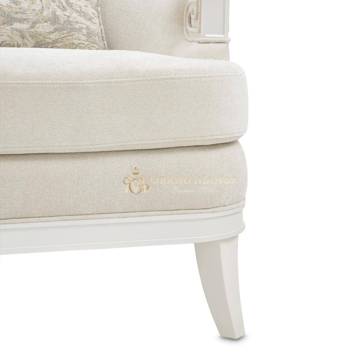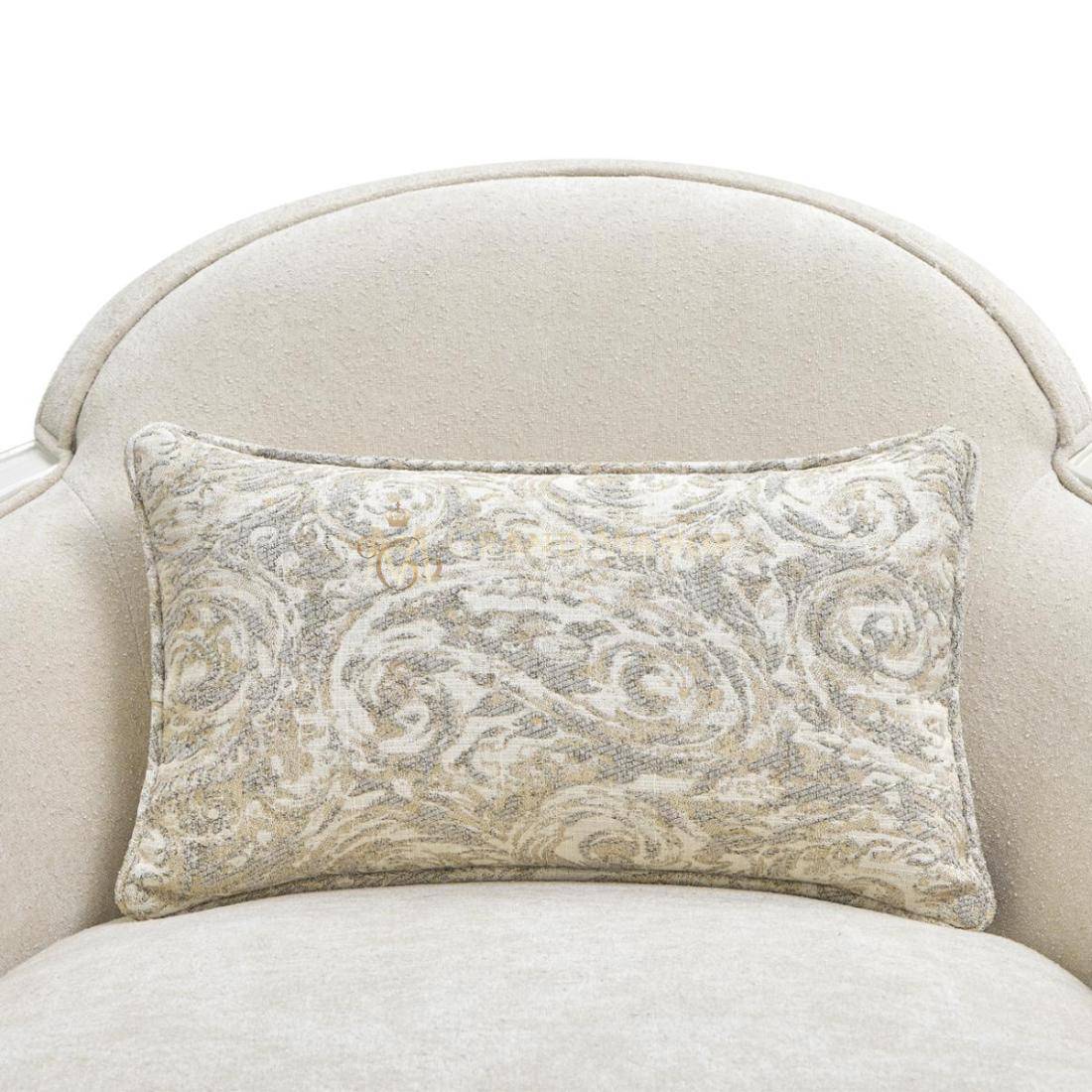 Кресло La Marisia создано для того, чтобы добавить элегантности любому интерьеру. Оно воплощает утонченную красоту благодаря мягкой обивке из шенилла нежного оттенка, которая создает ощущение уюта. Изящная окантовка подчеркивает изогнутый силуэт, а фестончатая спинка, сочетая классическое вдохновение с современной изысканностью, становится архитектурным акцентом. Подлокотники украшают завитками в форме греческого ключа, намекая на мастерство, неподвластное времени. Каркас в светлых жемчужных тонах придает креслу скульптурный вид. Завершающая акцентная подушка с перьевой набивкой из жаккардовой ткани делает это изделие не только красивым, но и притягательным.