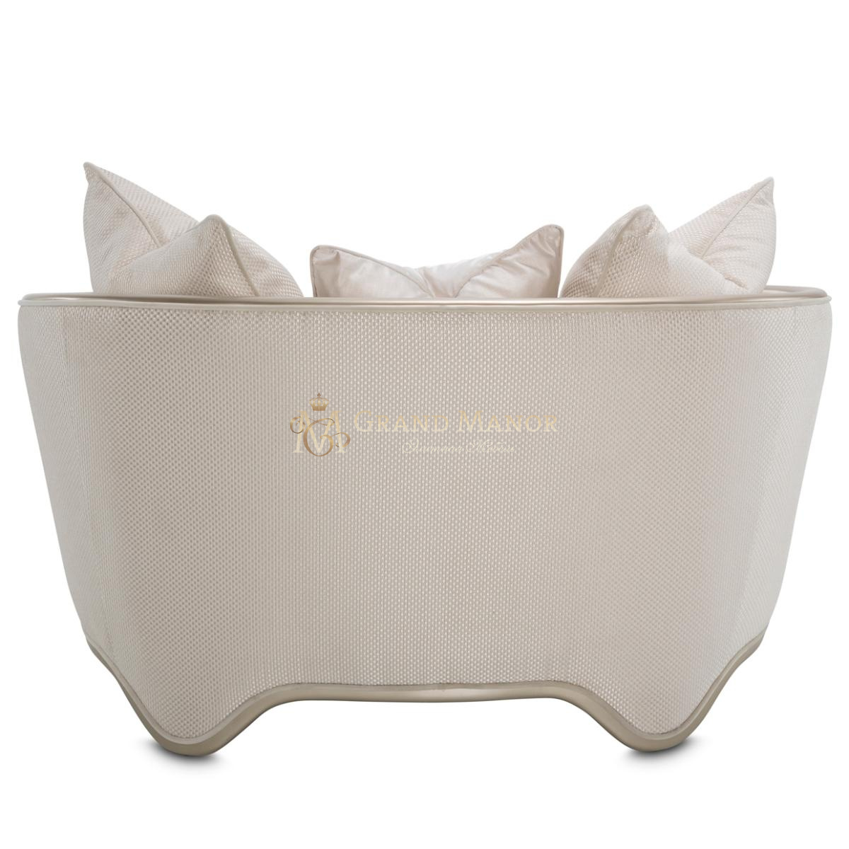 Сиденье и корпус кресла обиты тканью цвета шампанского, имитирующей шелк-сырец.