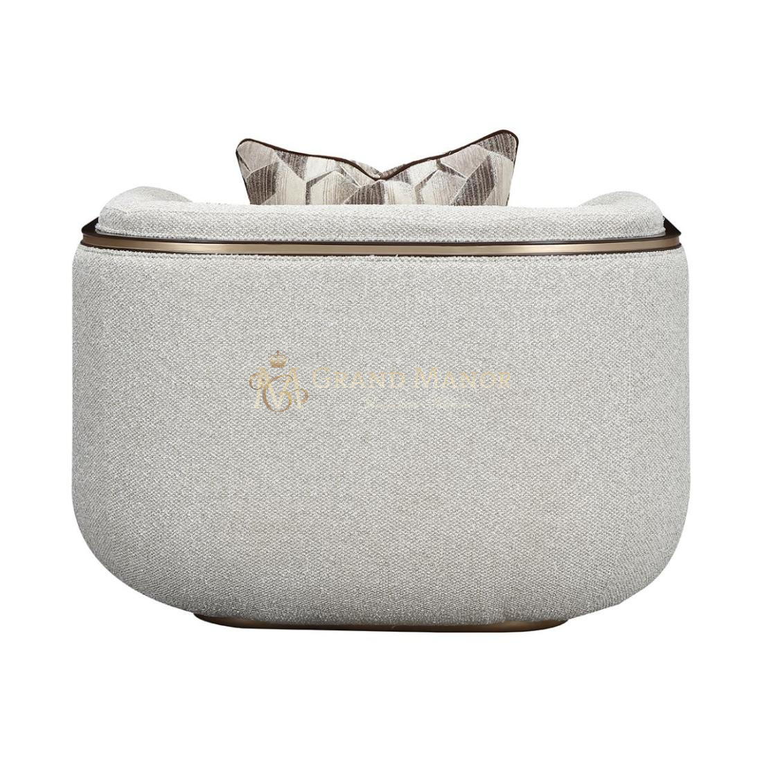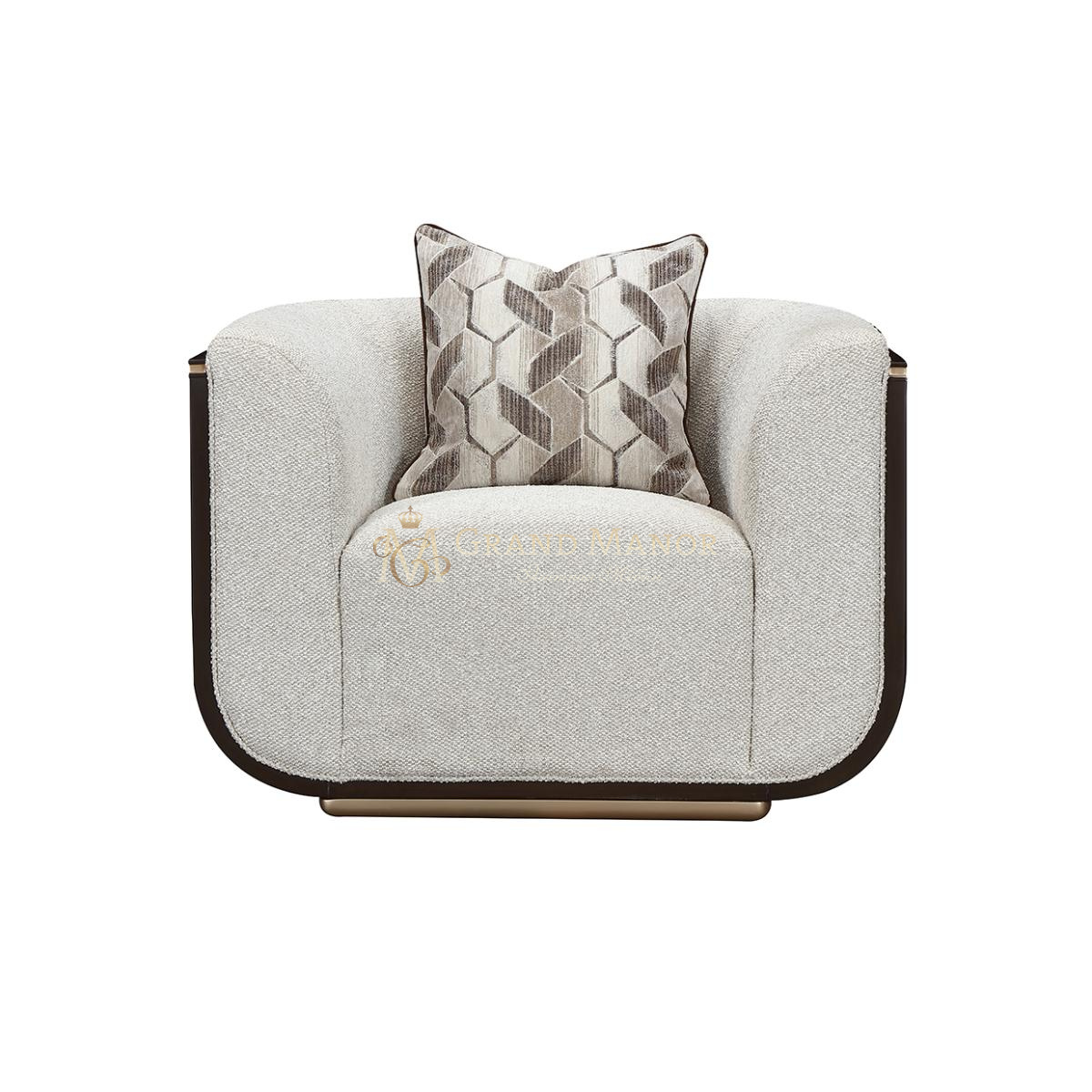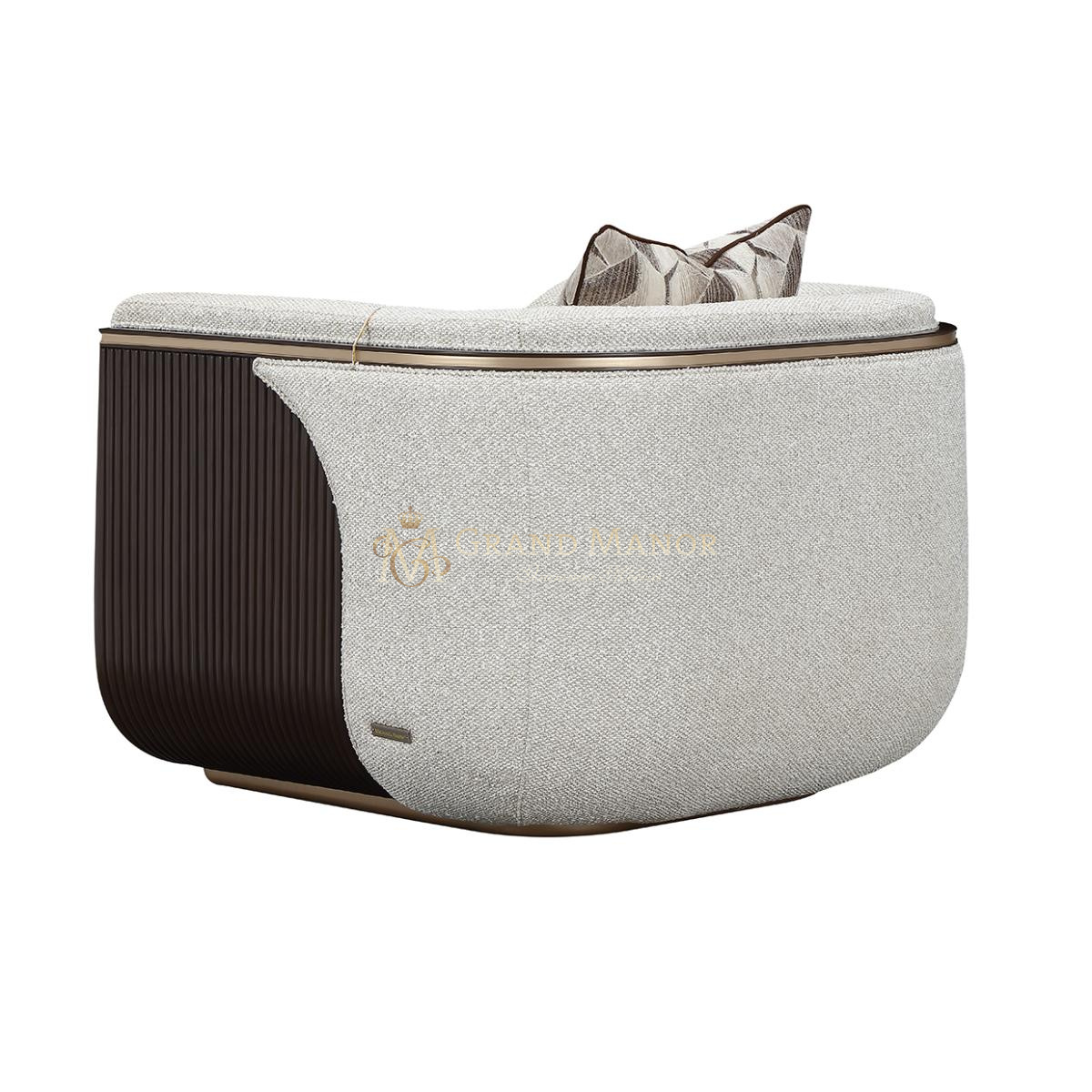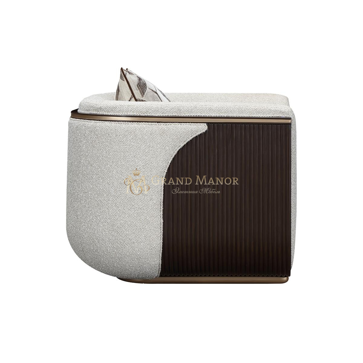 Скульптурный силуэт украшен тростниковыми панелями цвета эспрессо, придающими креслу смелый архитектурный акцент. Золотая отделка подчеркивает изящные изгибы, добавляя утонченности. Подушка из жаккарда, наполненная перьями, дополняет образ, делая кресло одновременно элегантным и визуально впечатляющим.