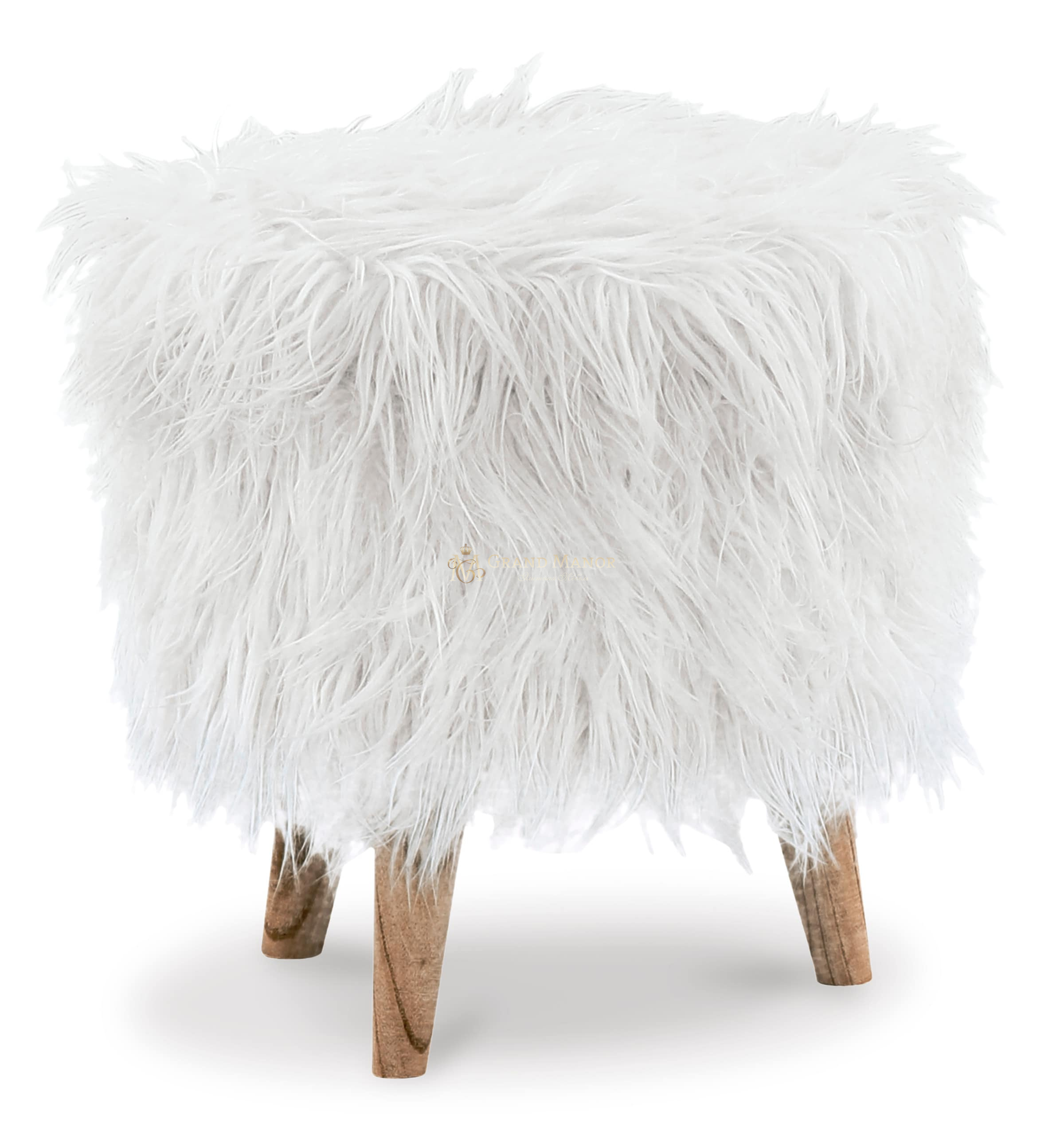 Этот веселый пуфик в стиле бохо-шик оснащен круглым сиденьем из искусственного меха белого цвета, поддерживаемым четырьмя коническими ножками из натурального дерева.