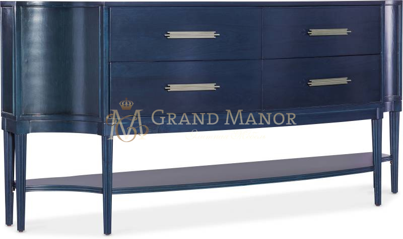 Классический силуэт тумбы Mazarine получил новое воплощение: передняя часть с изгибами, насыщенная темно-синяя отделка поверх вишневого шпона и рифленые конические ножки.