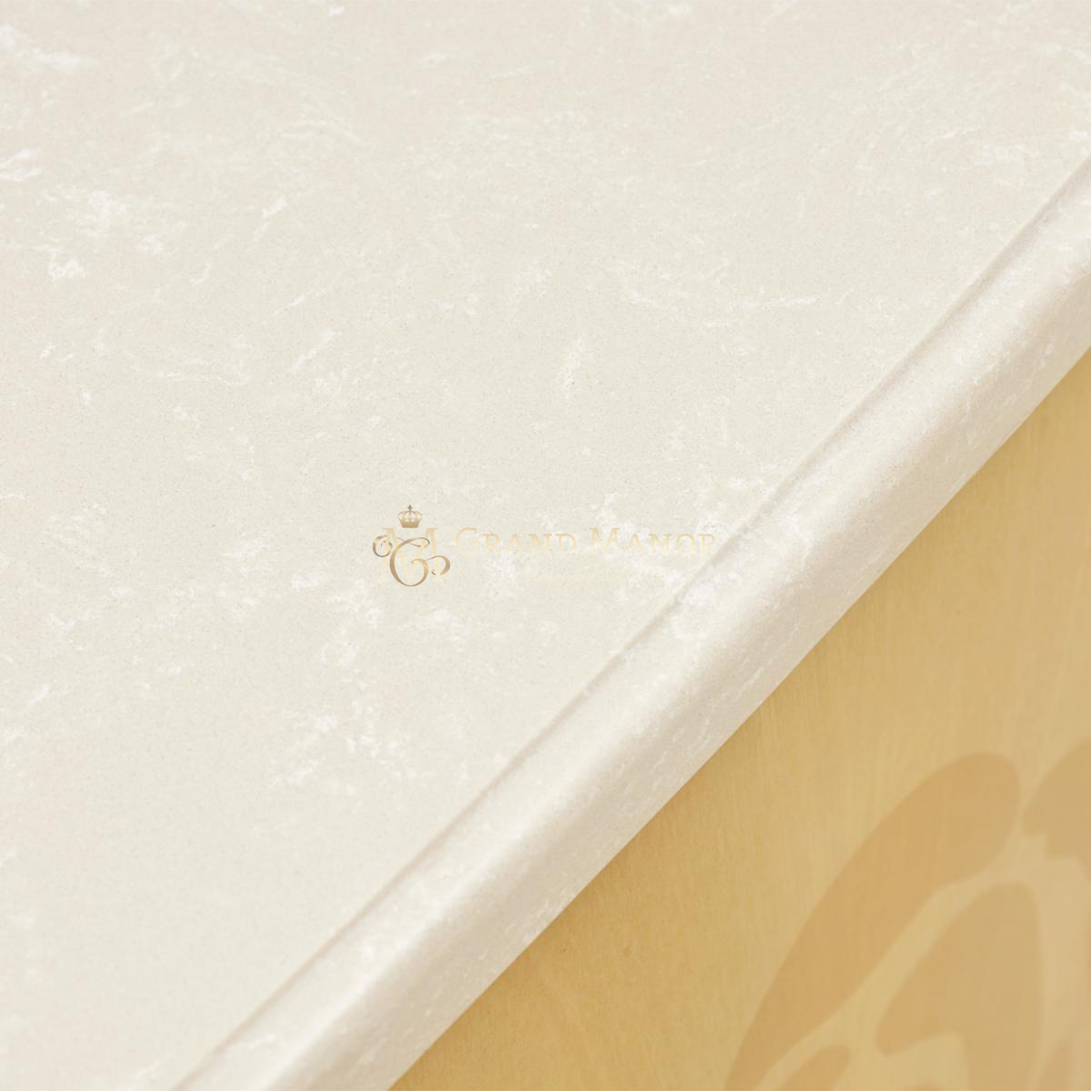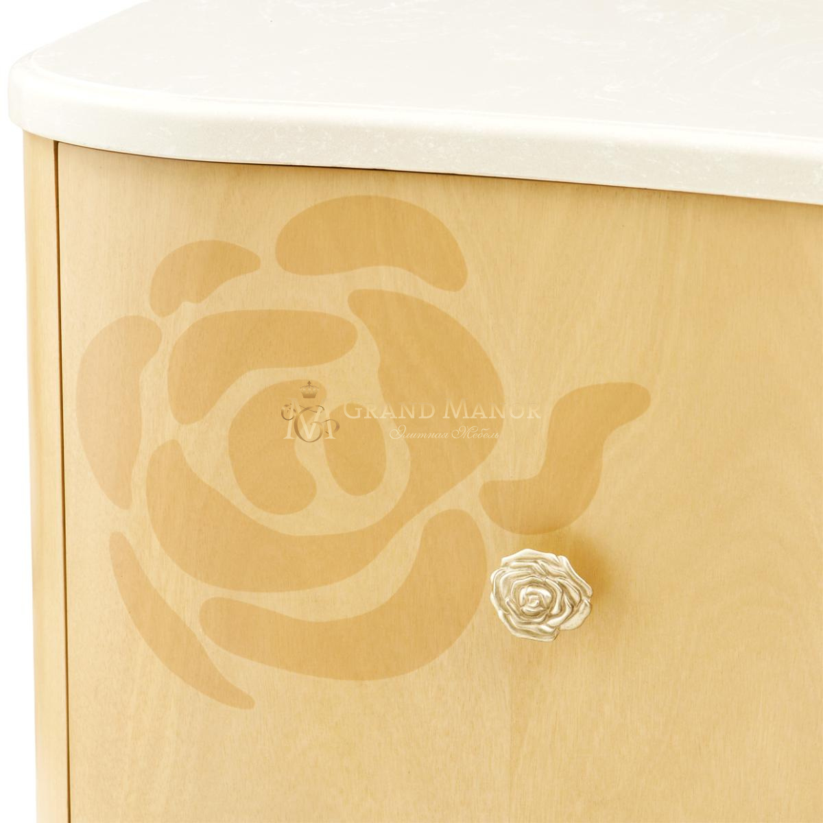 Дверцы шкафа украшены маркетри из камелии, а теплые карамельные оттенки и золотистые вставки цвета шампанского придают ему особое очарование. Фирменные ручки в виде цветов камелии и роскошная мраморная столешница добавляют ему шарма.