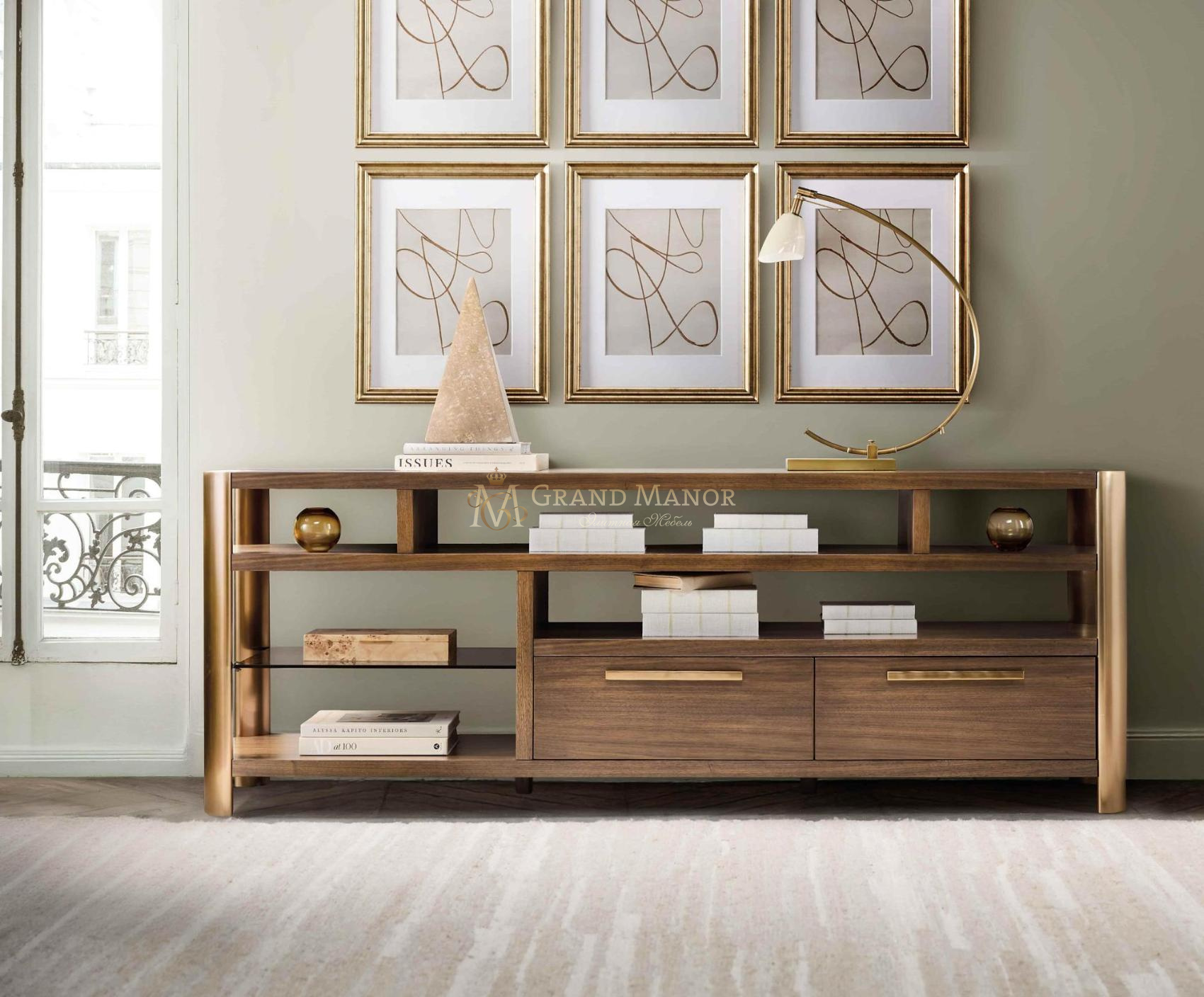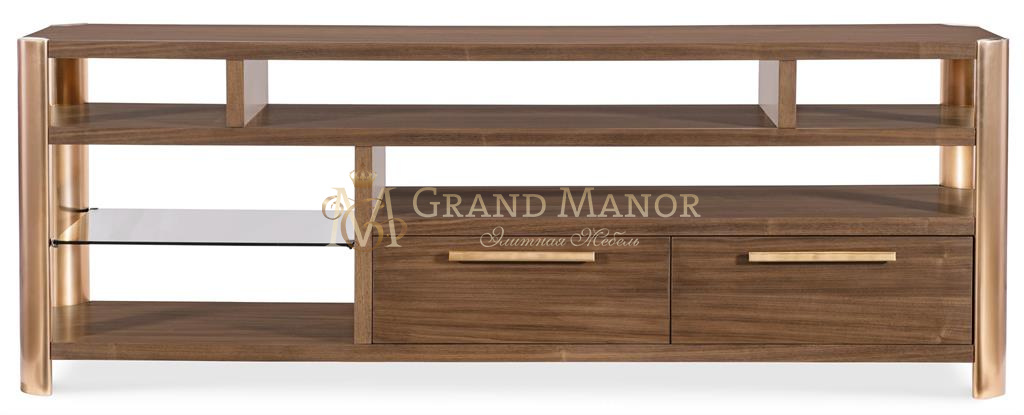 Преобразите свое медиа-пространство с помощью консоли Eleana Entertainment, выполненной из светло-карамельного шпона орехового дерева, металлических ножек с покрытием и стеклянных полок, окрашенных в цвет солнечной бронзы. Благодаря кабель-каналам, двум самозакрывающимся выдвижным ящикам и регулируемым полкам, она столь же практична, сколь и изысканна.