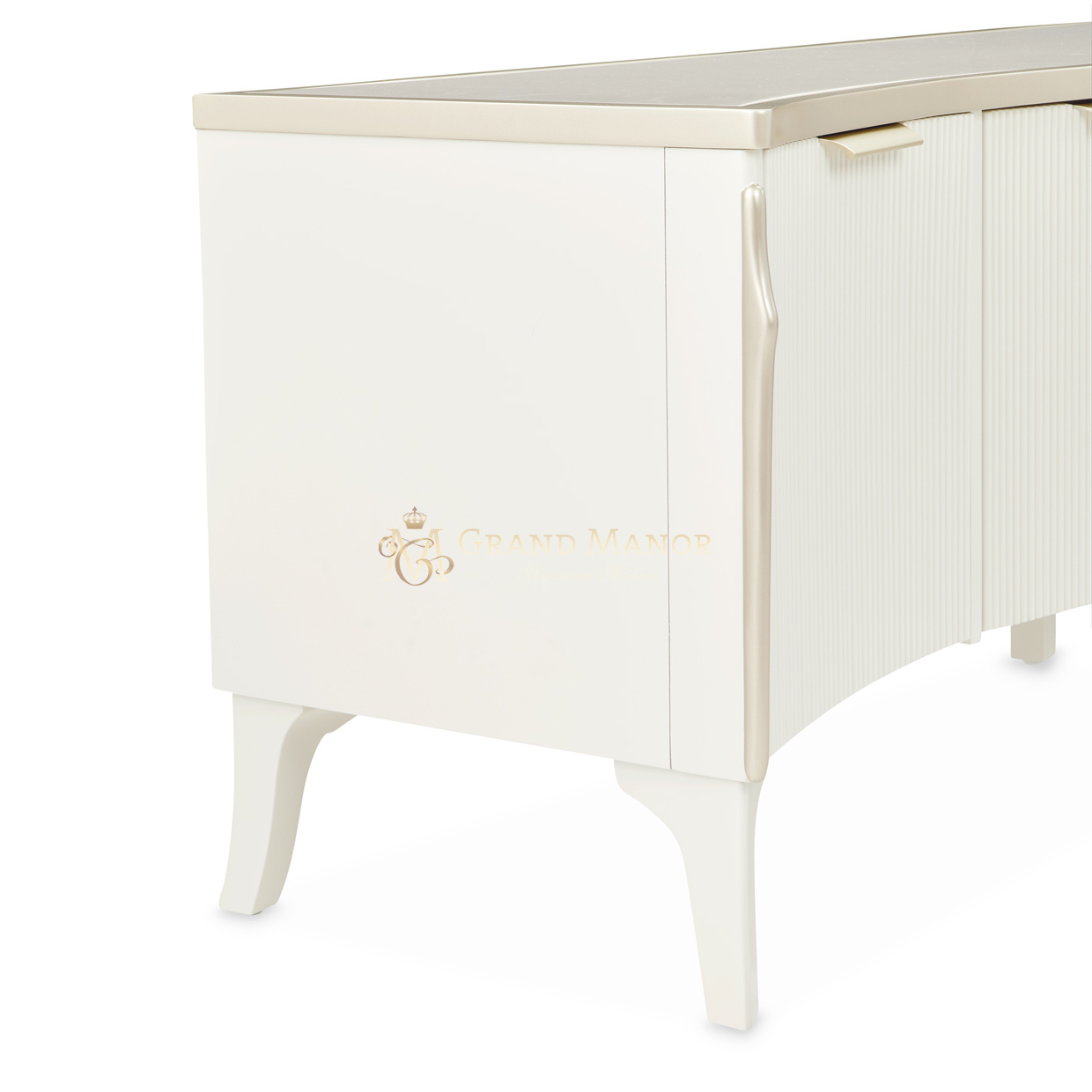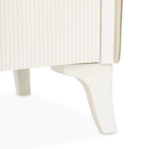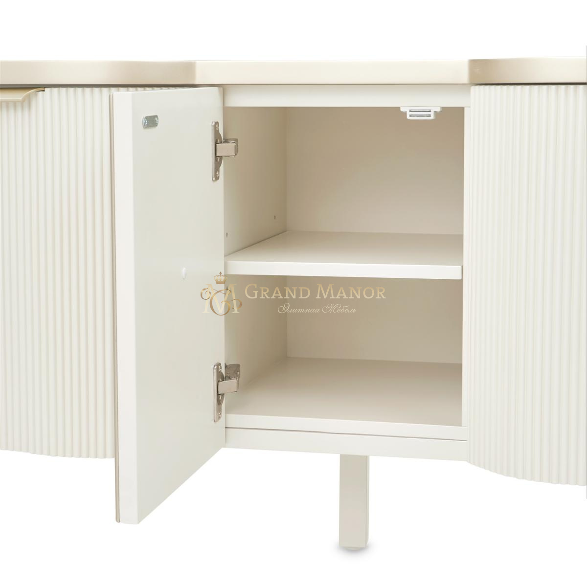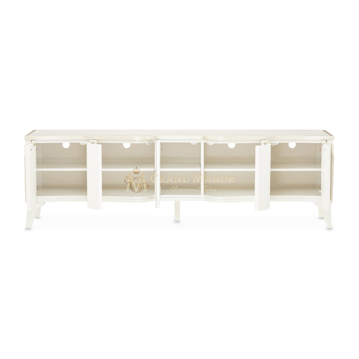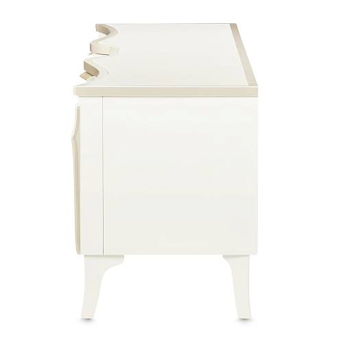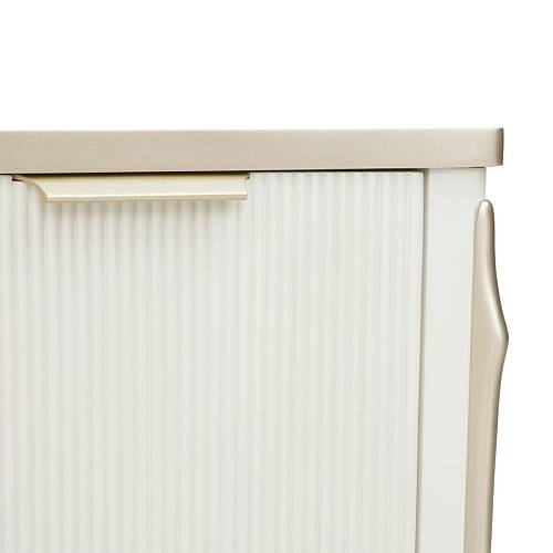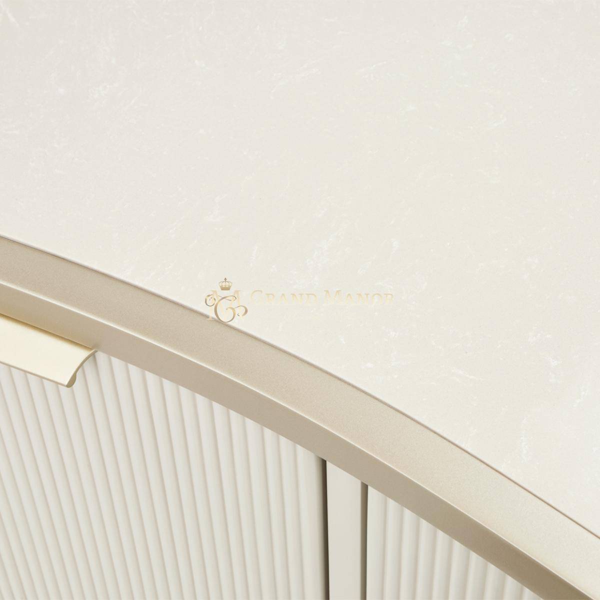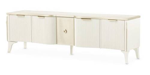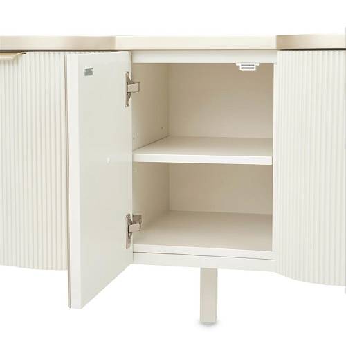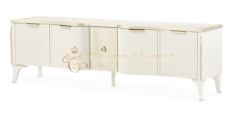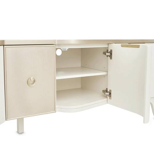 В медиа-консоли La Marisia элегантность и функциональность сливаются в единое целое. Это изделие, созданное для того, чтобы привлекать внимание, отличается изящно изогнутым силуэтом, выполненным в нежном жемчужном оттенке с акцентами цвета шампанского.