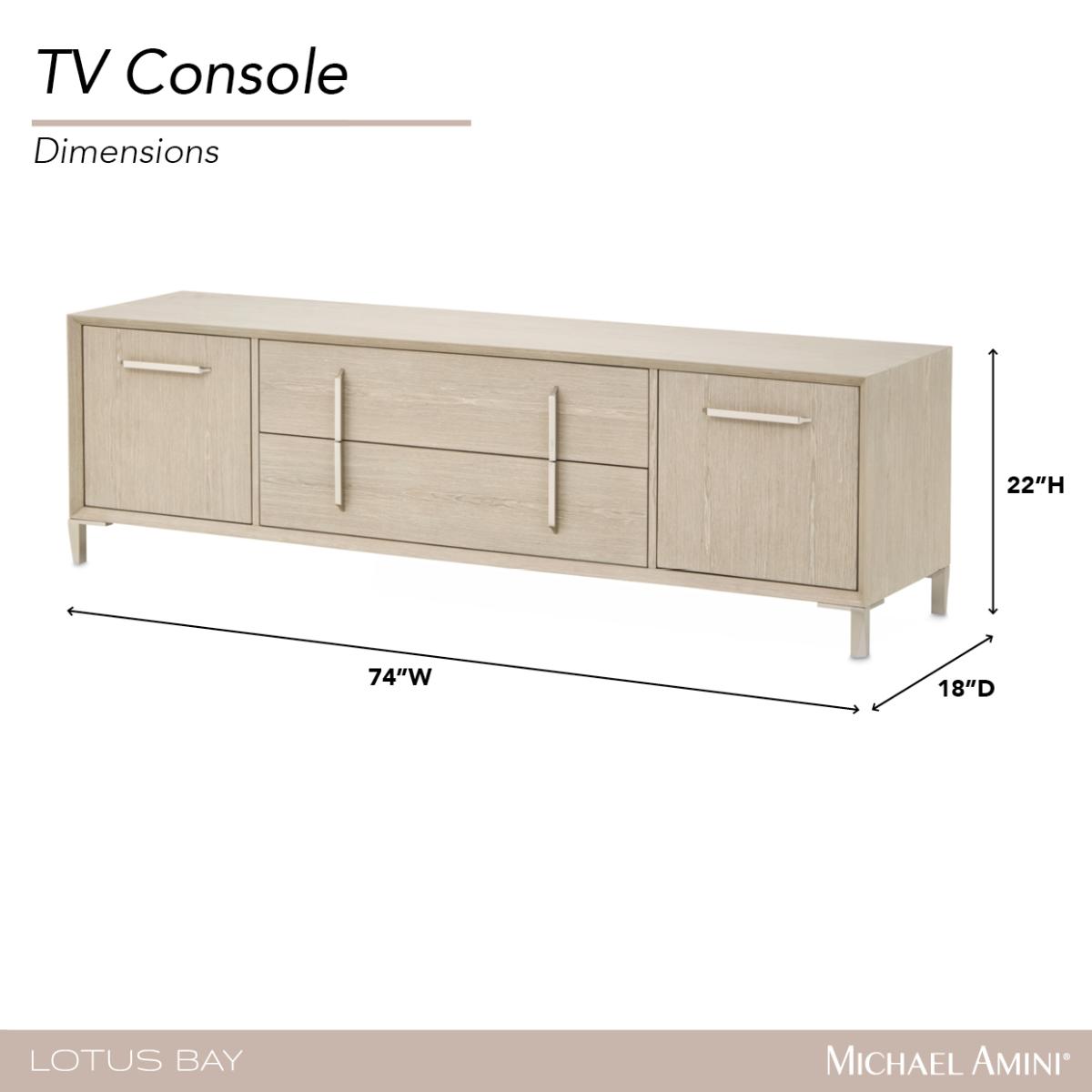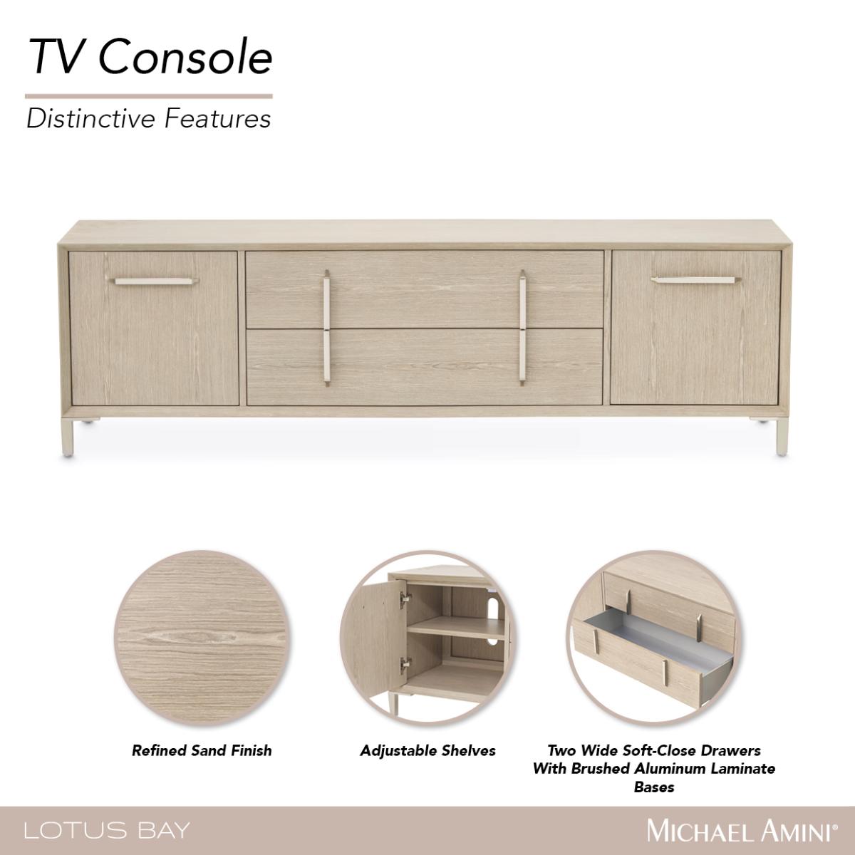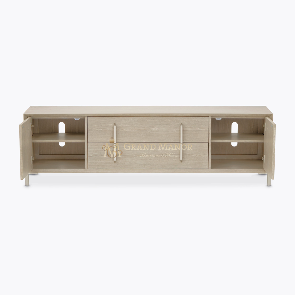 Медиа-консоль Lotus Bay, спроектированная с использованием чистых линий и безмятежной песочной отделки, излучает спокойную изысканность и в то же время отвечает требованиям современного стиля жизни.