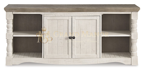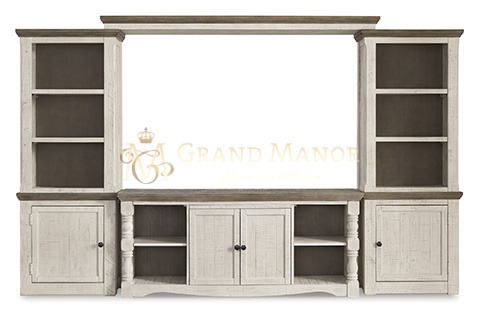 Эта ТВ-стенка состаренного серого цвета с винтажным белым создаёт совершенно очаровательный эффект. Колонны придают стенке солидный вид, а множество открытых стеллажей делают эстетику совсем не тяжелой.