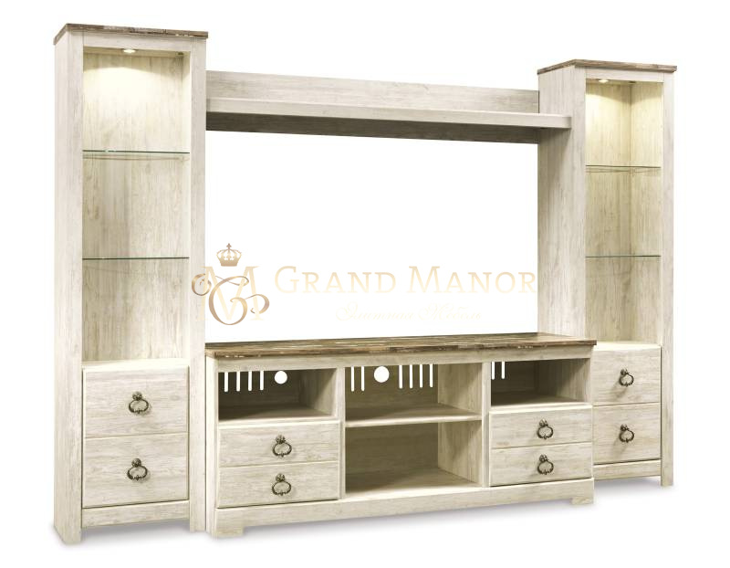 - Состоит из четырех частей: ТВ-тумбы, двух витрин и полки-перекрытия.