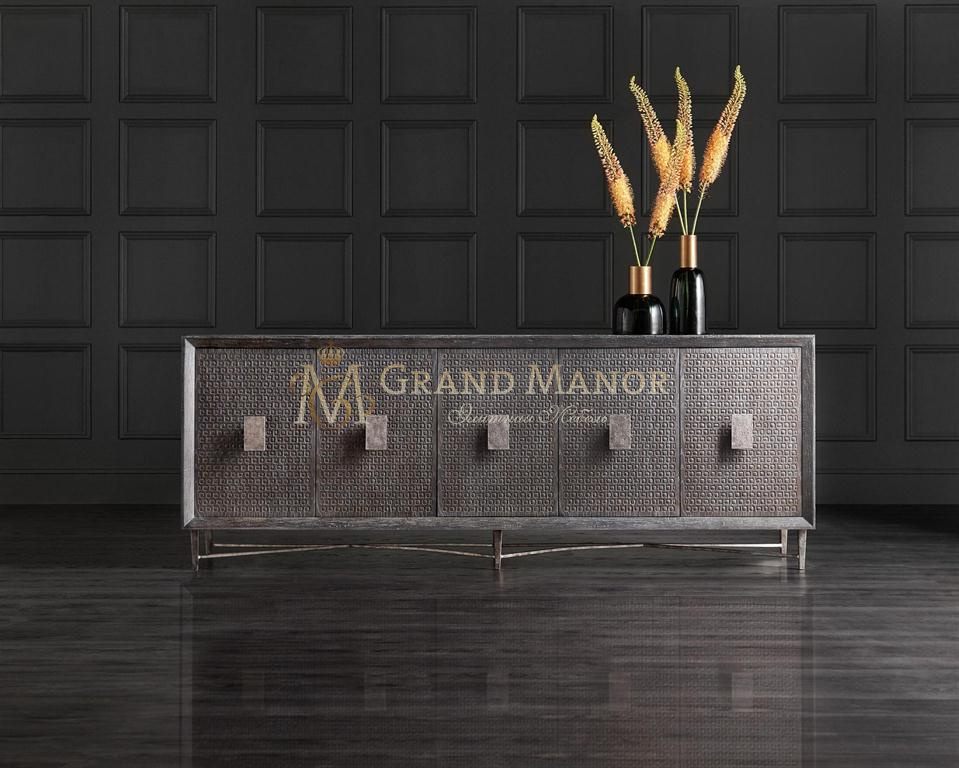 Пятидверная тумба Keenan, представляющая собой неожиданное эклектичное сочетание текстуры, формы и функциональности со сдержанной и неподвластной времени красотой, сочетает в себе тактильную поверхность, напоминающую плетение, с фигурным основанием из серебристого металла и потертой металлической фурнитурой в форме больших прямоугольников.