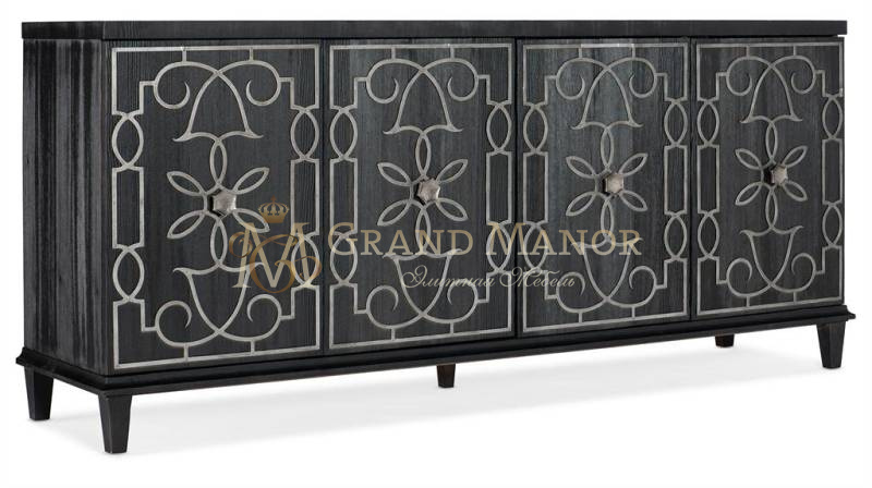 Модель Madeline с марокканским колоритом и элегантной черно-серебристой цветовой гаммой изготовлена из соснового шпона с отделкой из черного дерева, текстурированными металлическими шестиугольными ручками и серебряными вставками с цветочным мотивом.