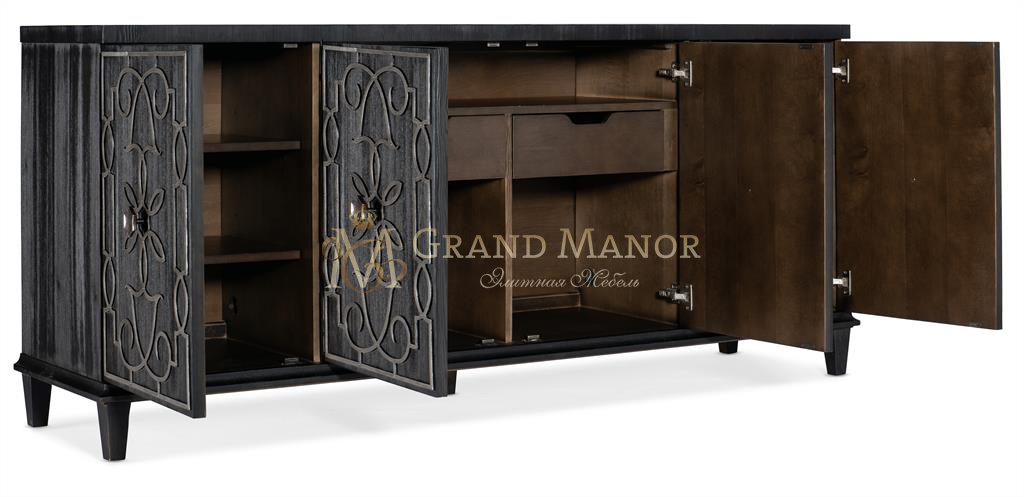 При четырех дверцах за каждой парой центральных дверей расположены по два выдвижных ящика, две регулируемые полки за каждой внешней дверью и одна фиксированная полка над ящиком в центральной секции.