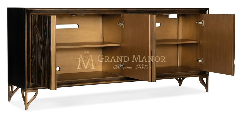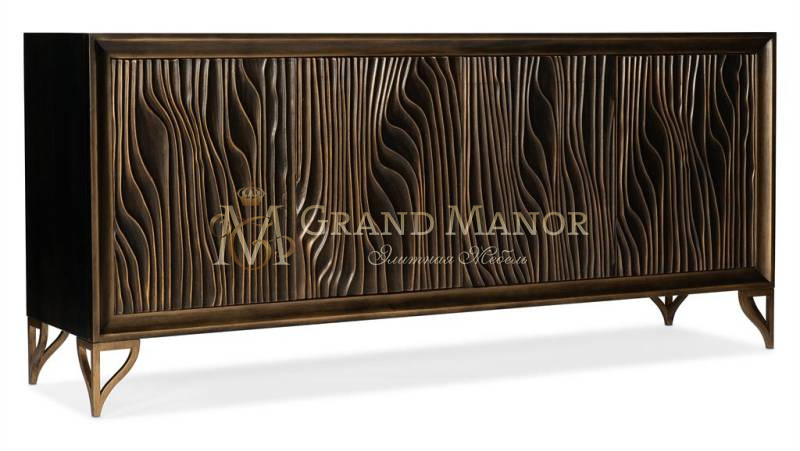 Наружная отделка из темного дерева с рифлеными фасадами дверей и золотыми акцентами. Золотые металлические ножки.