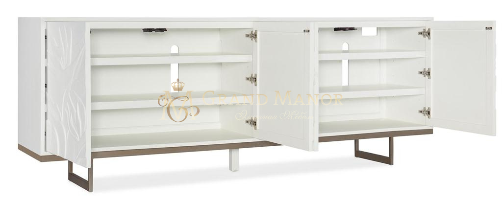 ТВ-Тумба Passerine сочетает в себе нежный рельефный цветочный мотив спереди с безупречно белой отделкой и золотистой металлической основой.