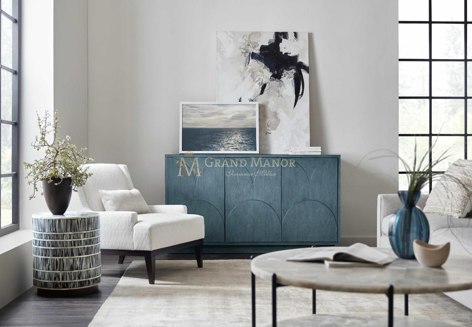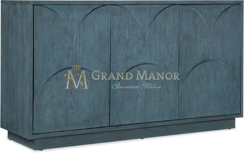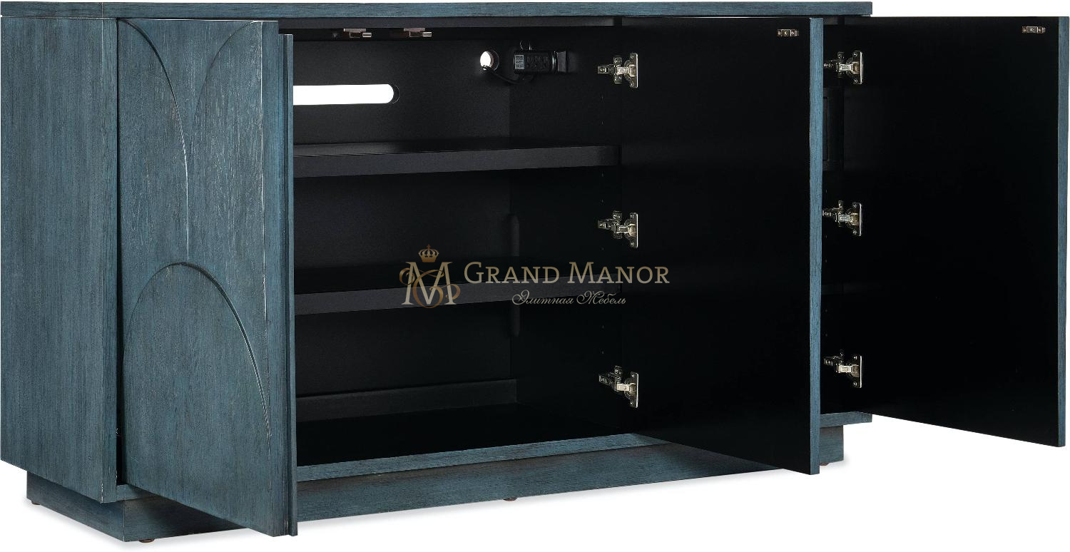 Консоль, изготовленная из дубового шпона и композита, оснащена четырьмя фигурными дверцами с сенсорной защелкой и одной регулируемой полкой за каждой парой дверей.