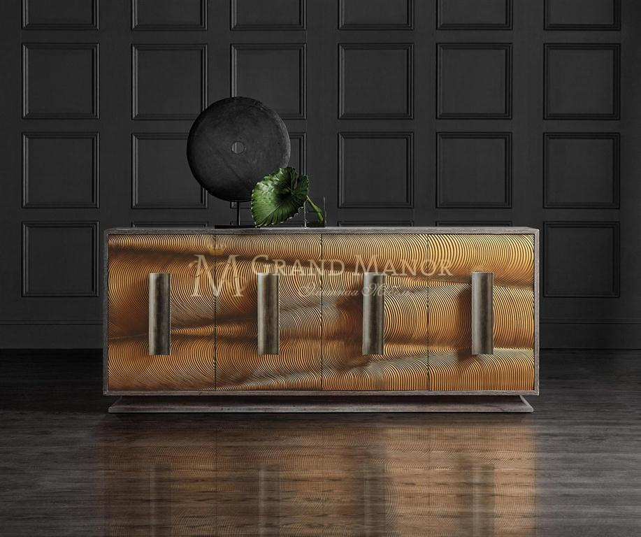 Четырехдверная тумба Swaley от Mélange, обладающая земной и экзотической элегантностью, имеет поразительный силуэт с эффектным золотым завитком спереди, подчеркнутым эффектной изогнутой вертикальной фурнитурой в форме прямоугольника.