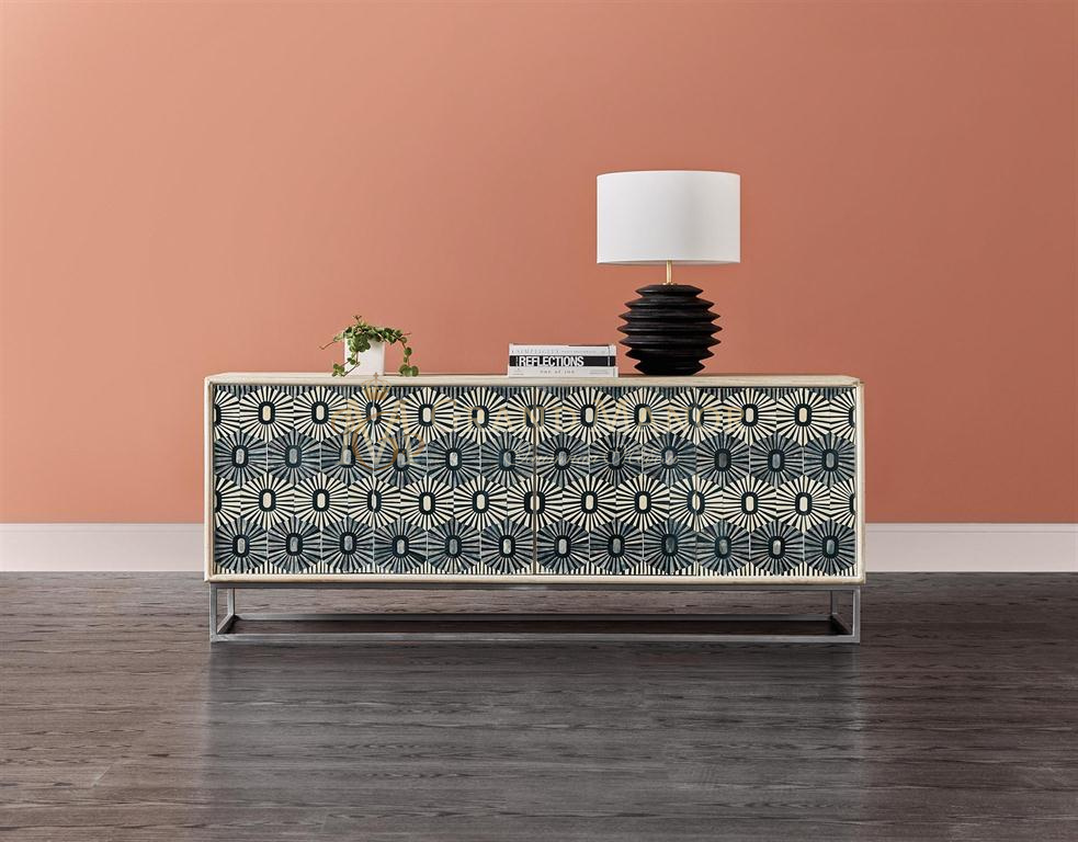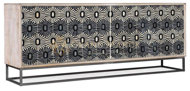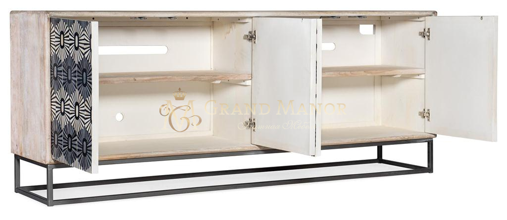 Абстрактный художественный узор, выполненный с использованием костяной инкрустации в черно-бело-серой цветовой гамме, делает тв-тумбу Whitmore единственным в своем роде художественным акцентом.