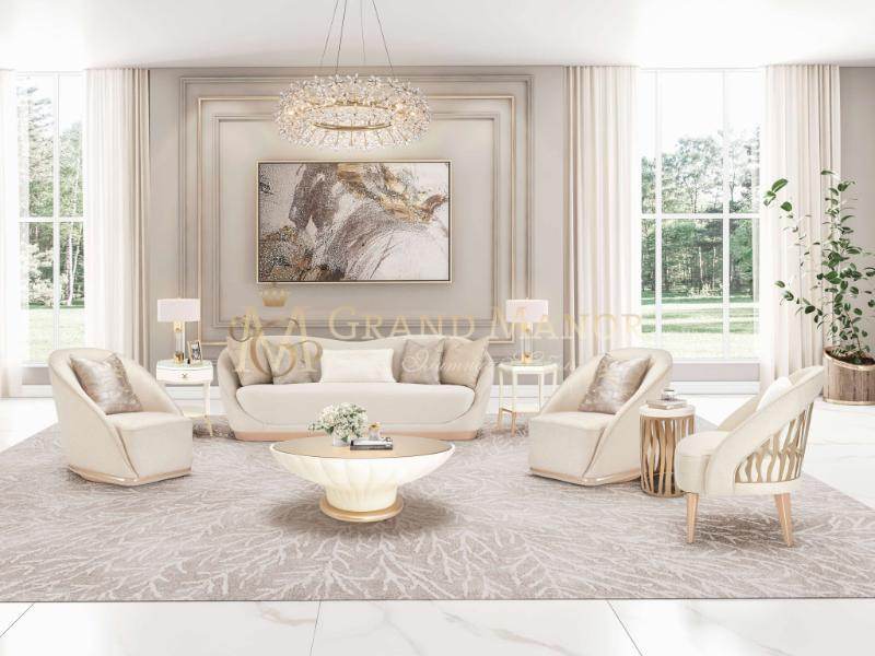 Обито жаккардовой тканью платинового цвета с золотыми вставками.