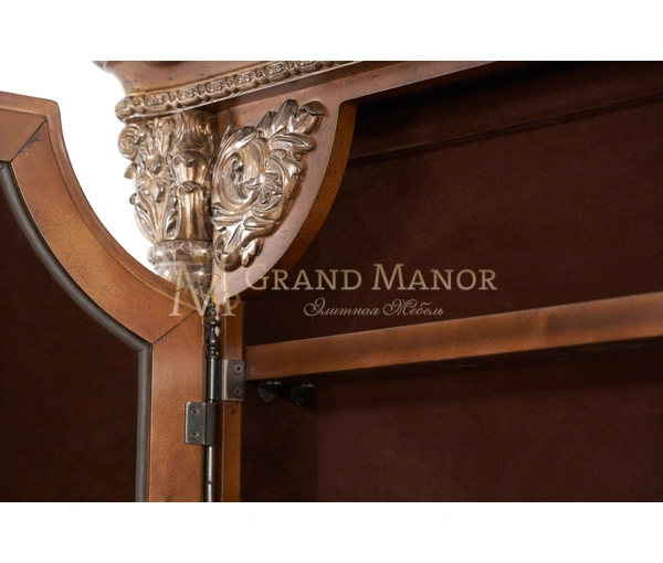 Зеркало из коллекции Villa Valencia преобразит интерьер спальни, сделает его оригинальным. Для каркаса напольного зеркала был выбран массив березы, прочный и вместе с тем гибкий, долговечный материал. Большое зеркало обработано фацетом, уникальной технологией, позволяющей добиться бриллиантового блеска зеркального полотна. Особенностью этой модели зеркала является то, что оно открывается, как дверь, за которой расположены семь полок. Искусная резьба выполнена мастерами компании вручную. Применение технологии патинирования придает изделию особый шарм старины.