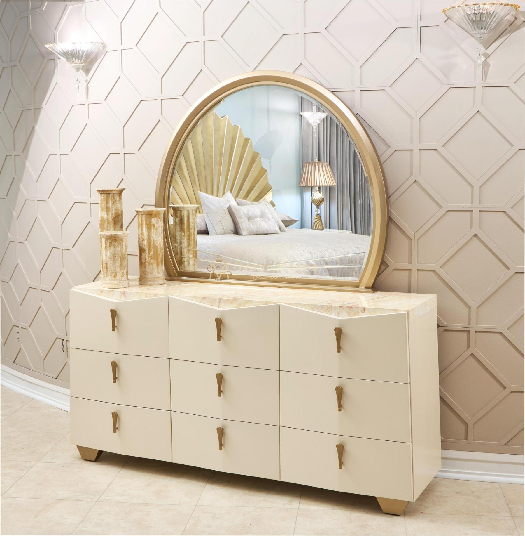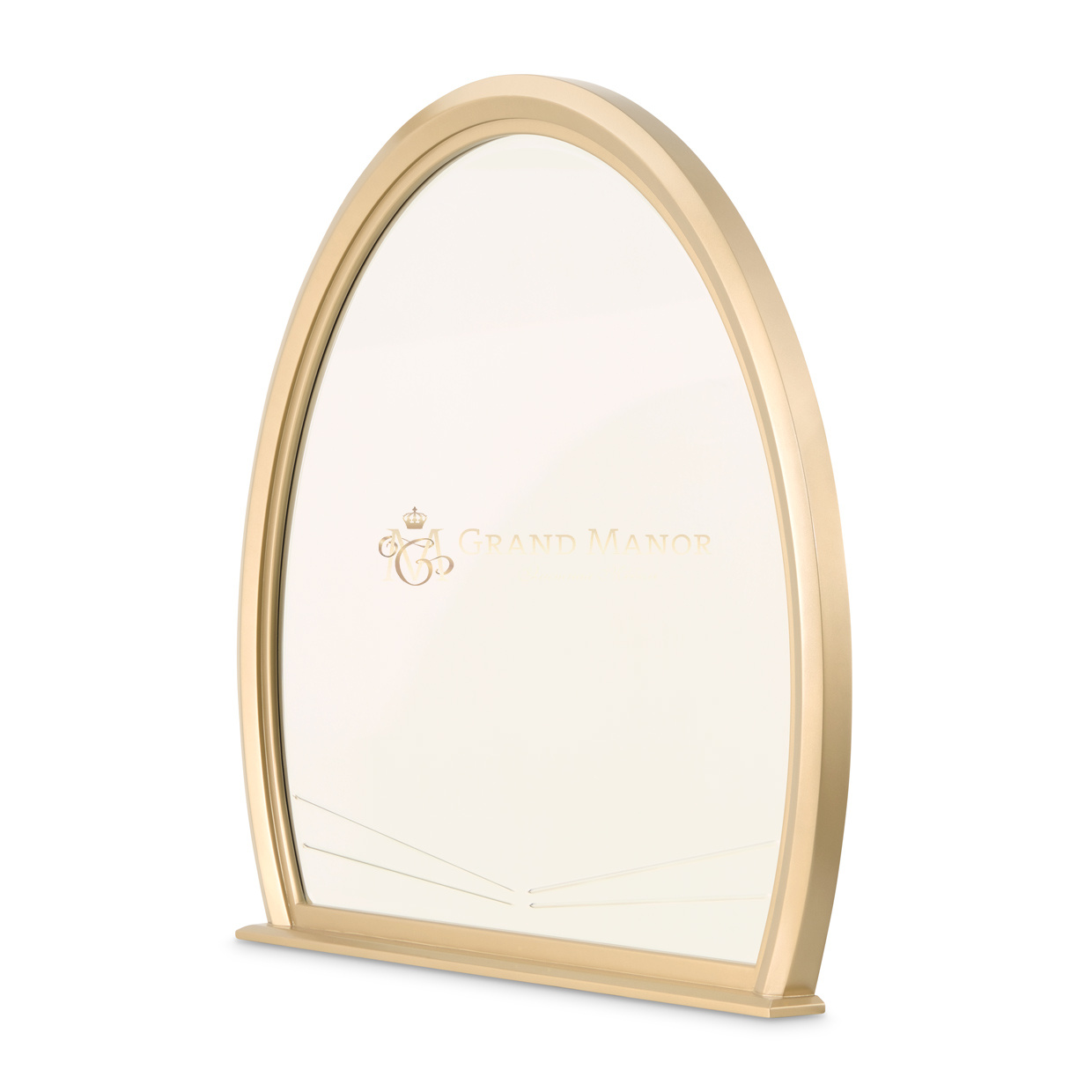 Это зеркало, прекрасно дополняющее комод Fantosini, привнесет в вашу спальню скульптурную элегантность и свет. Его величественная круглая форма обрамлена теплым матовым золотом, которое перекликается с фирменной фурнитурой коллекции, создавая целостную и утонченную эстетику. В основании