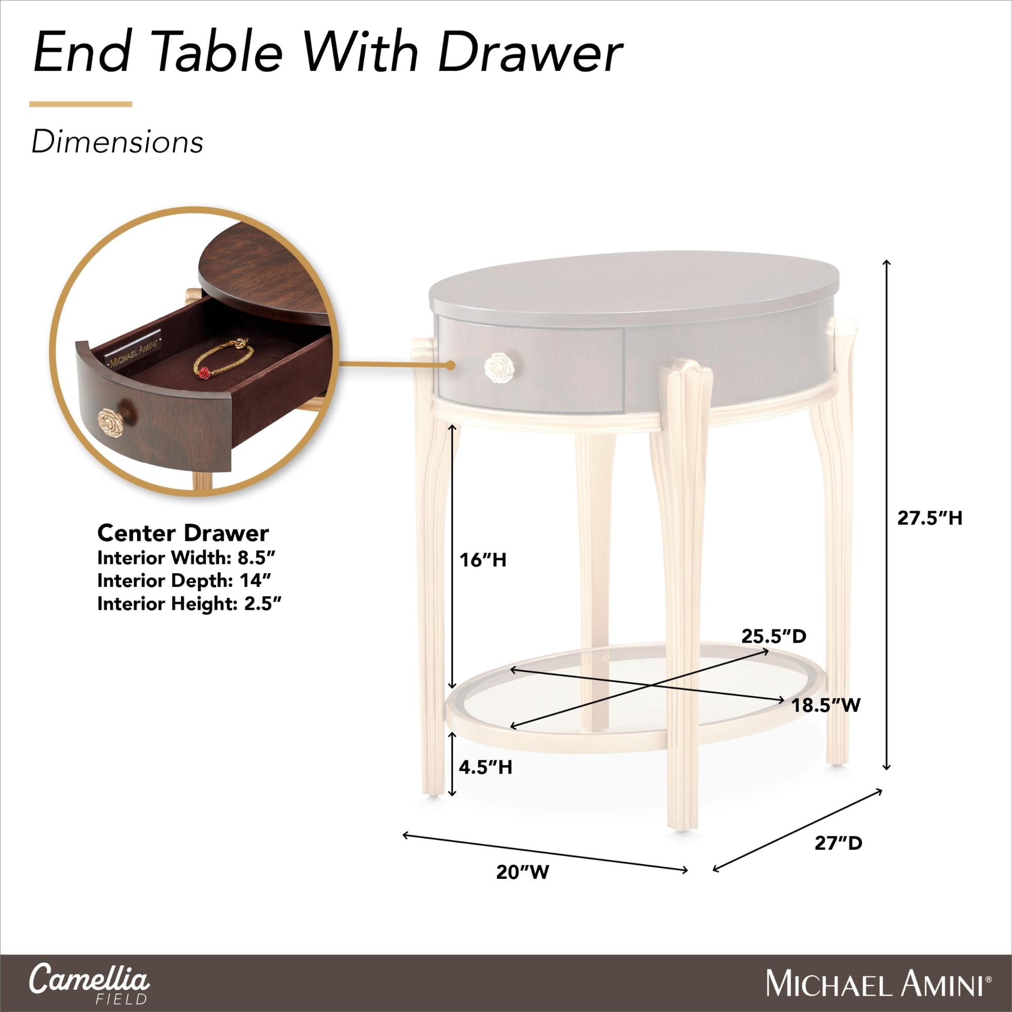 Торцевой столик Camellia Field с выдвижным ящиком — это идеальное сочетание красоты и практичности. Тёплая отделка орехом пекан с изысканными деталями маркетри придаёт ему утончённый артистизм.