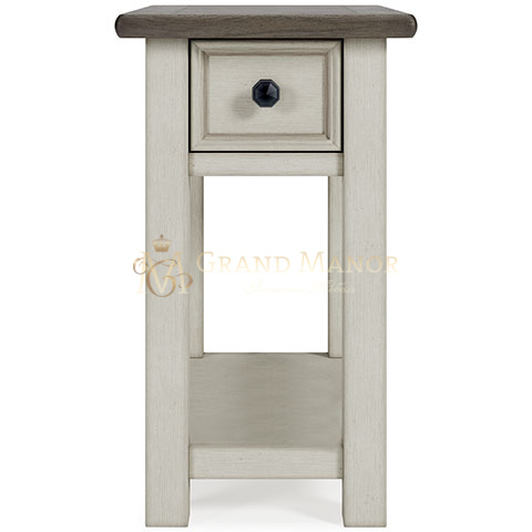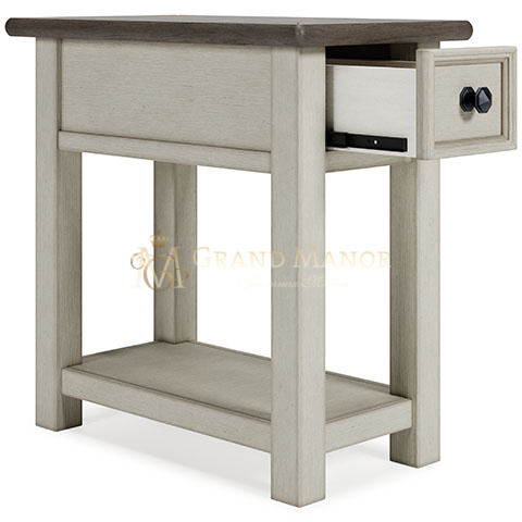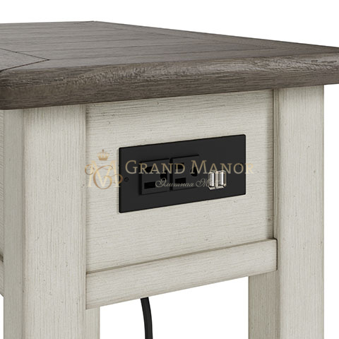 Его двухцветная отделка сочетает в себе выветрившийся дуб и античный белый цвет, что придает ему гораздо более причудливый характер. Очаровательные элементы включают в себя столешницу в виде досок и рамы, черную граненую фурнитуру и плавно выдвигающийся ящик для пультов дистанционного управления и многое другое.