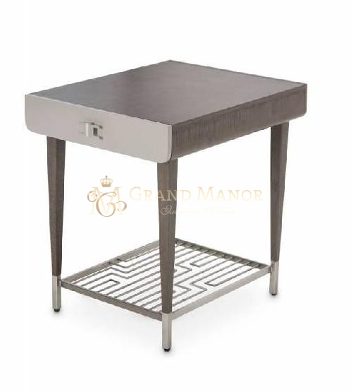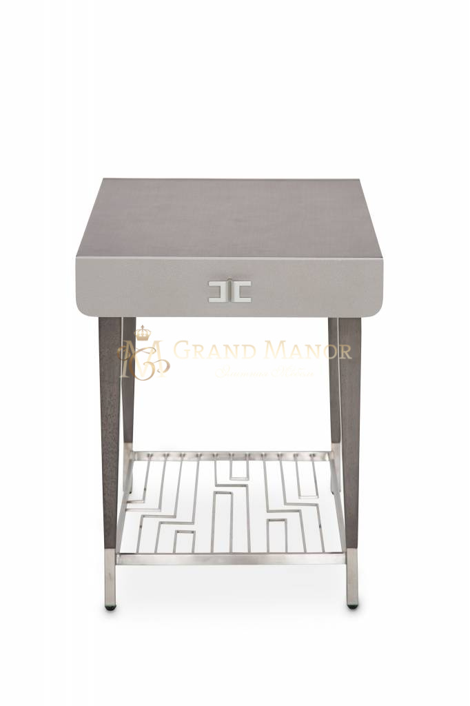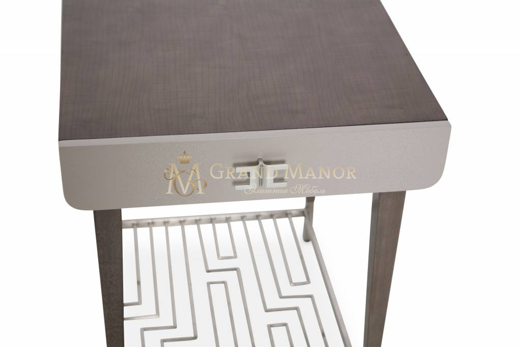 Нижняя часть стола выполнена в металлическом геометрическом дизайне.