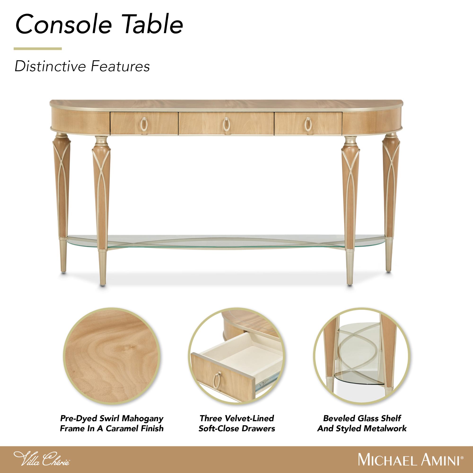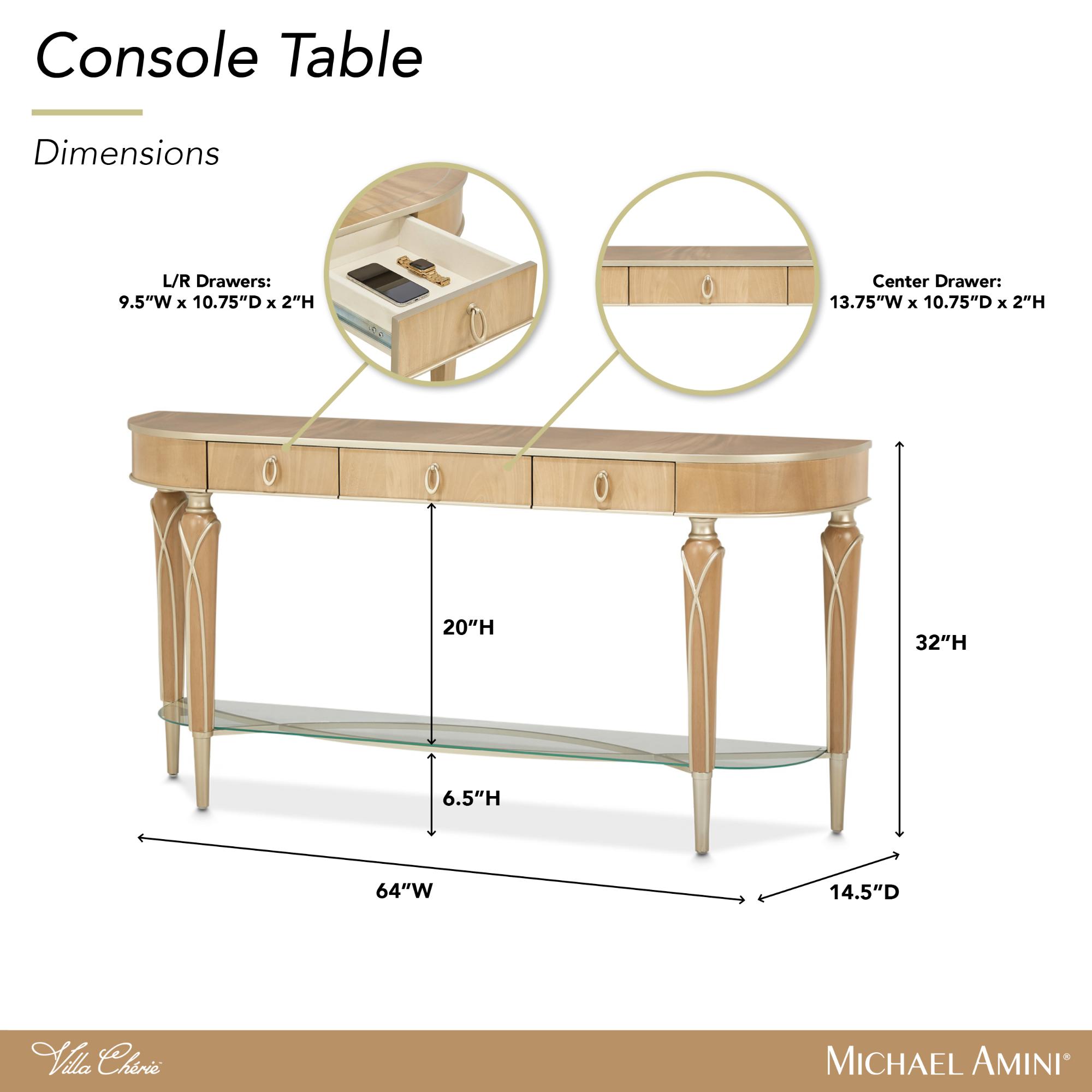 Пришло время проявить свой утонченный вкус. Консольный столик Villa Cherie оснащен изящными ручками-кольцами, удобным выдвижным ящиком и великолепными металлическими элементами под стеклянной полкой. Идеально подходящее для ярких комнатных растений, семейных фотографий и изящного декора, это изделие готово украсить стиль вашего дома.