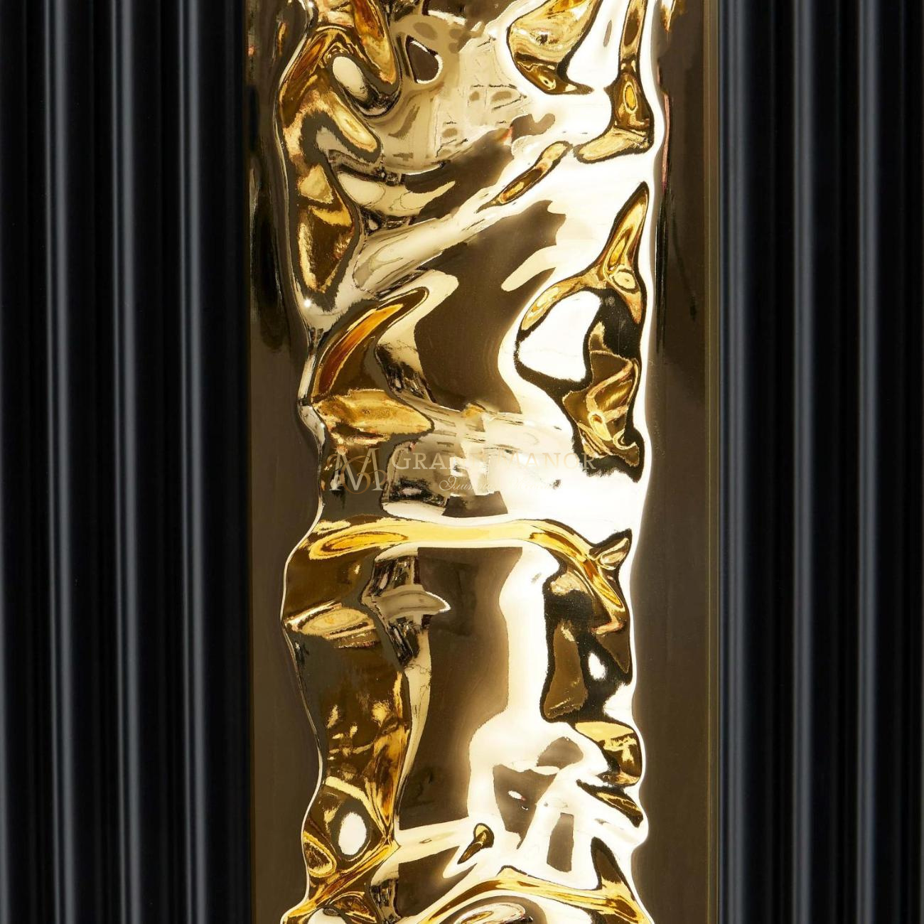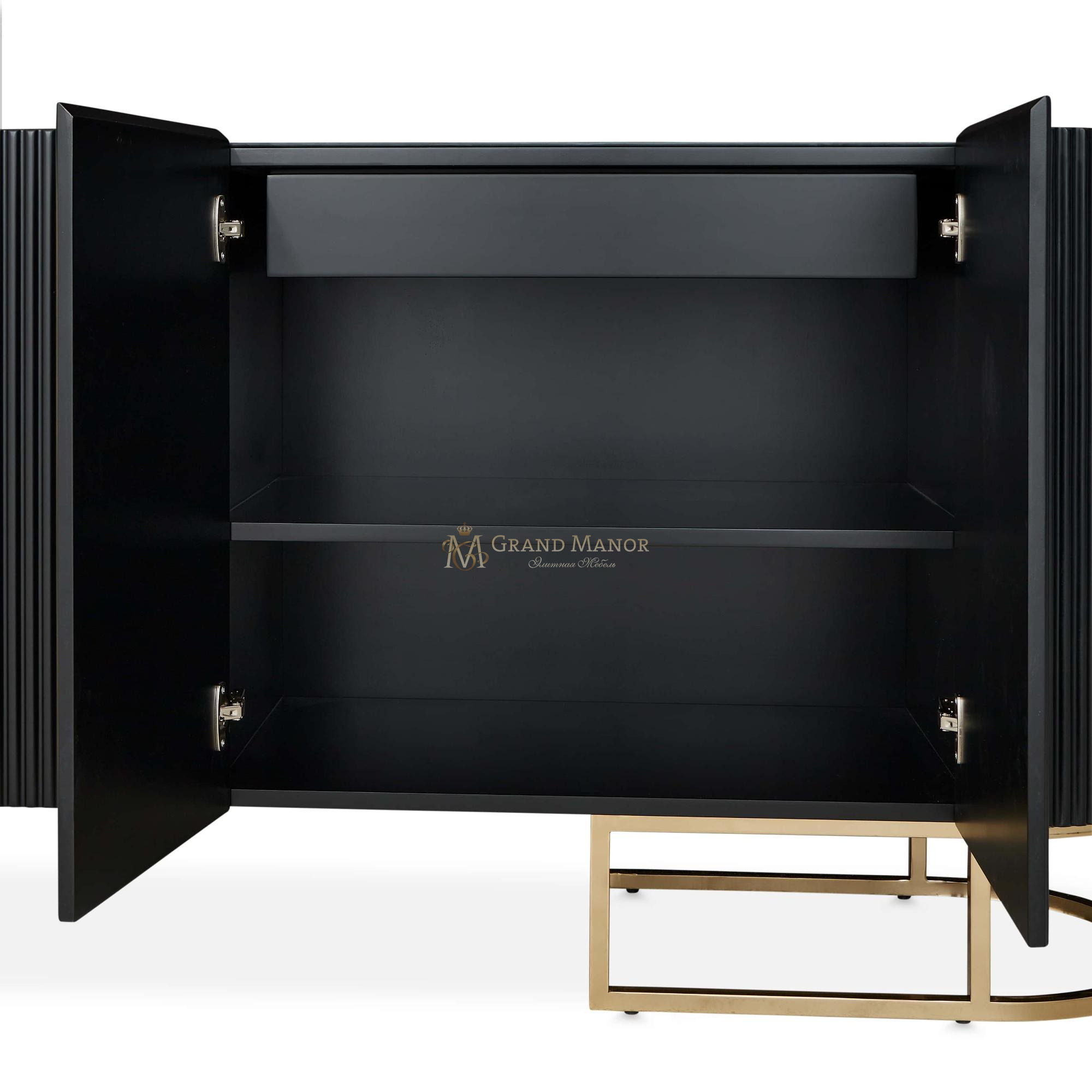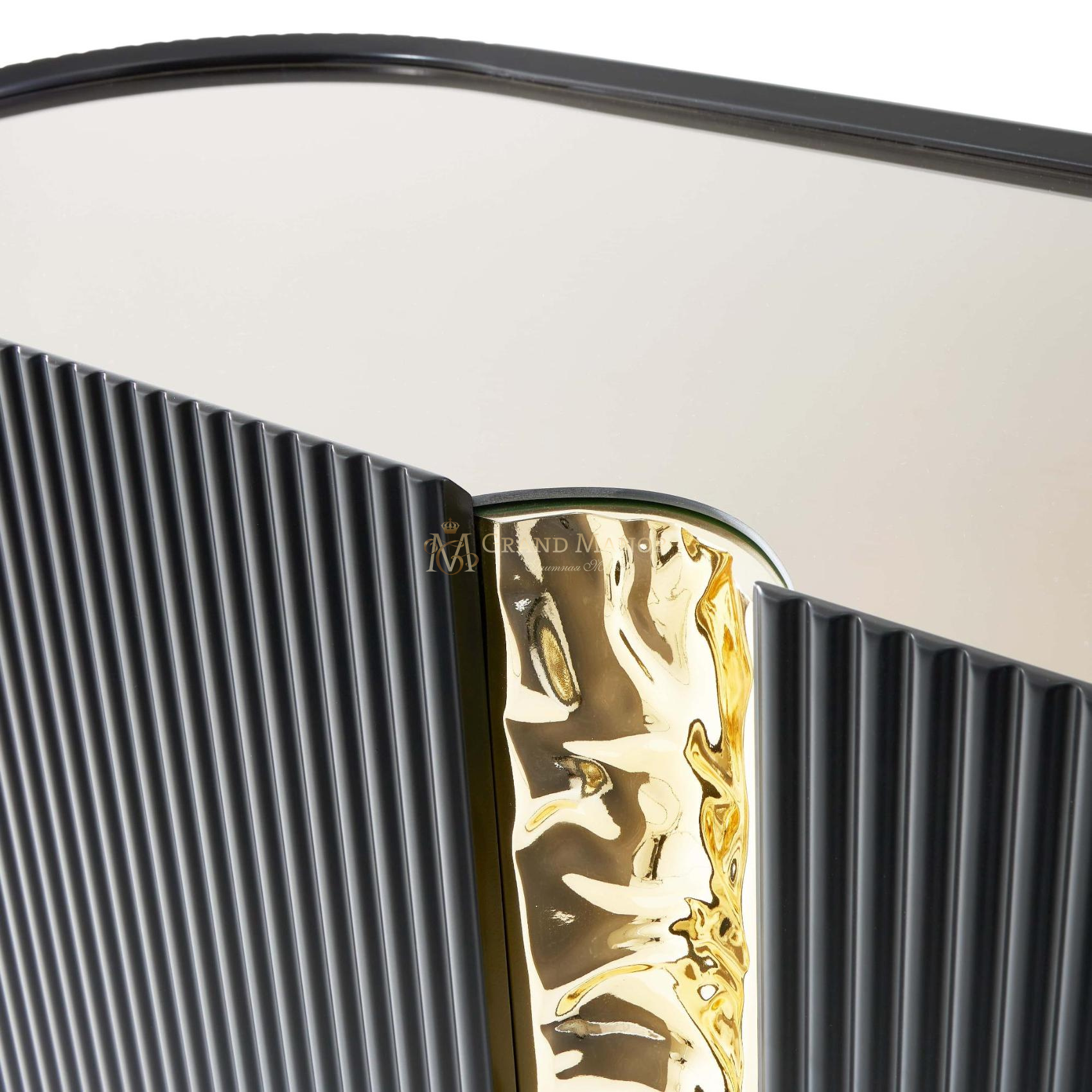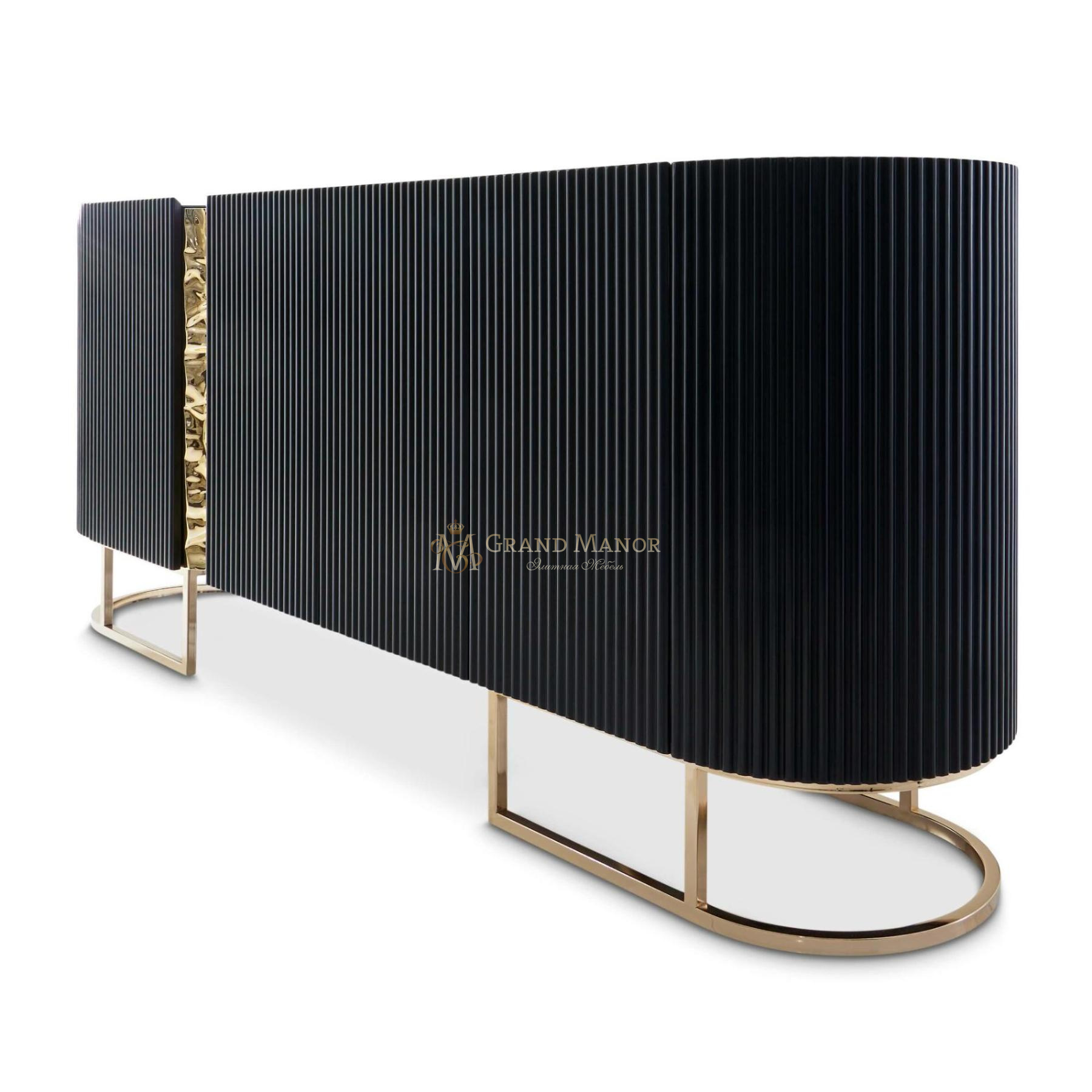 Консольный шкаф Lisbon воплощает утонченную элегантность с контрастным дизайном. Его изогнутый силуэт в матово-черном цвете украшен ребристыми элементами и золотым ободком, что создает яркий и запоминающийся образ. Тонированная зеркальная столешница усиливает ощущение роскоши. Шесть вместительных полок и скрытый выдвижной ящик делают шкаф идеальным для хранения в любом интерьере.