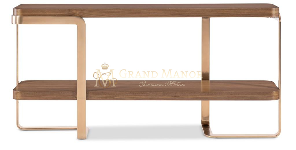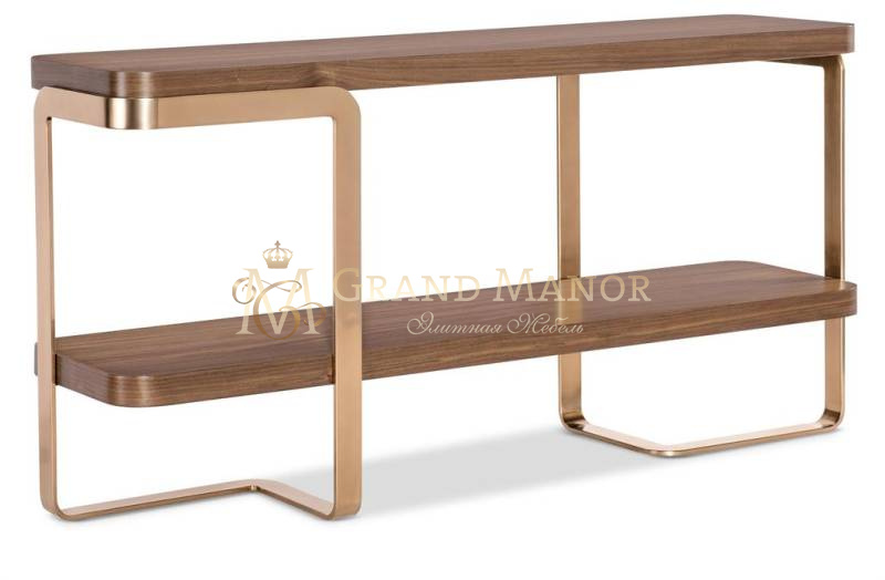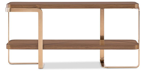 Изящный и универсальный консольный стол Eleana сочетает в себе светло-карамельный шпон орехового дерева с металлическим основанием из гнутого металла с бронзовым покрытием. Прямоугольная столешница с мягкими закруглениями и одна стационарная деревянная полка придают столу стиль и удобство хранения, что делает его идеальным акцентом для переходных помещений.