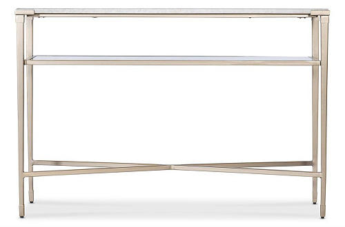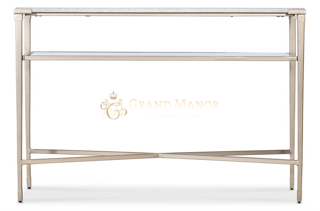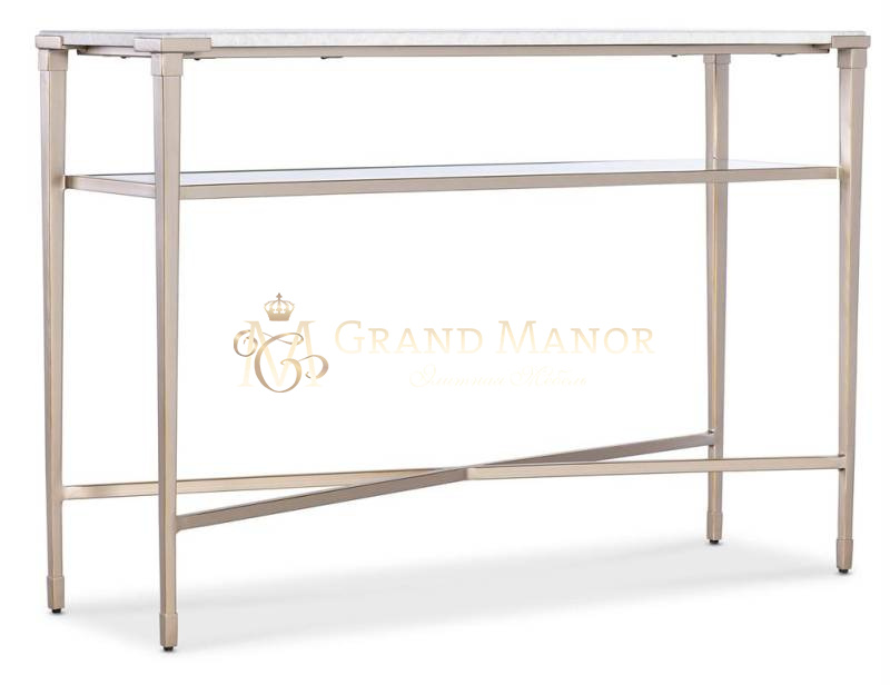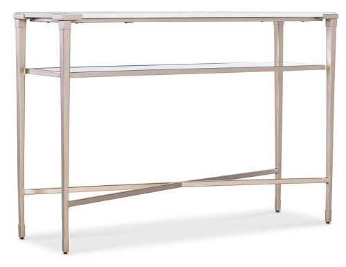 Изящный консольный столик Jen из коллекции Melange украсит вашу прихожую или гостиную. Столешница из натурального белого камня, тонкие металлические ножки цвета шампанского и полка из прозрачного стекла придают этому прямоугольному консольному столику современную элегантность.