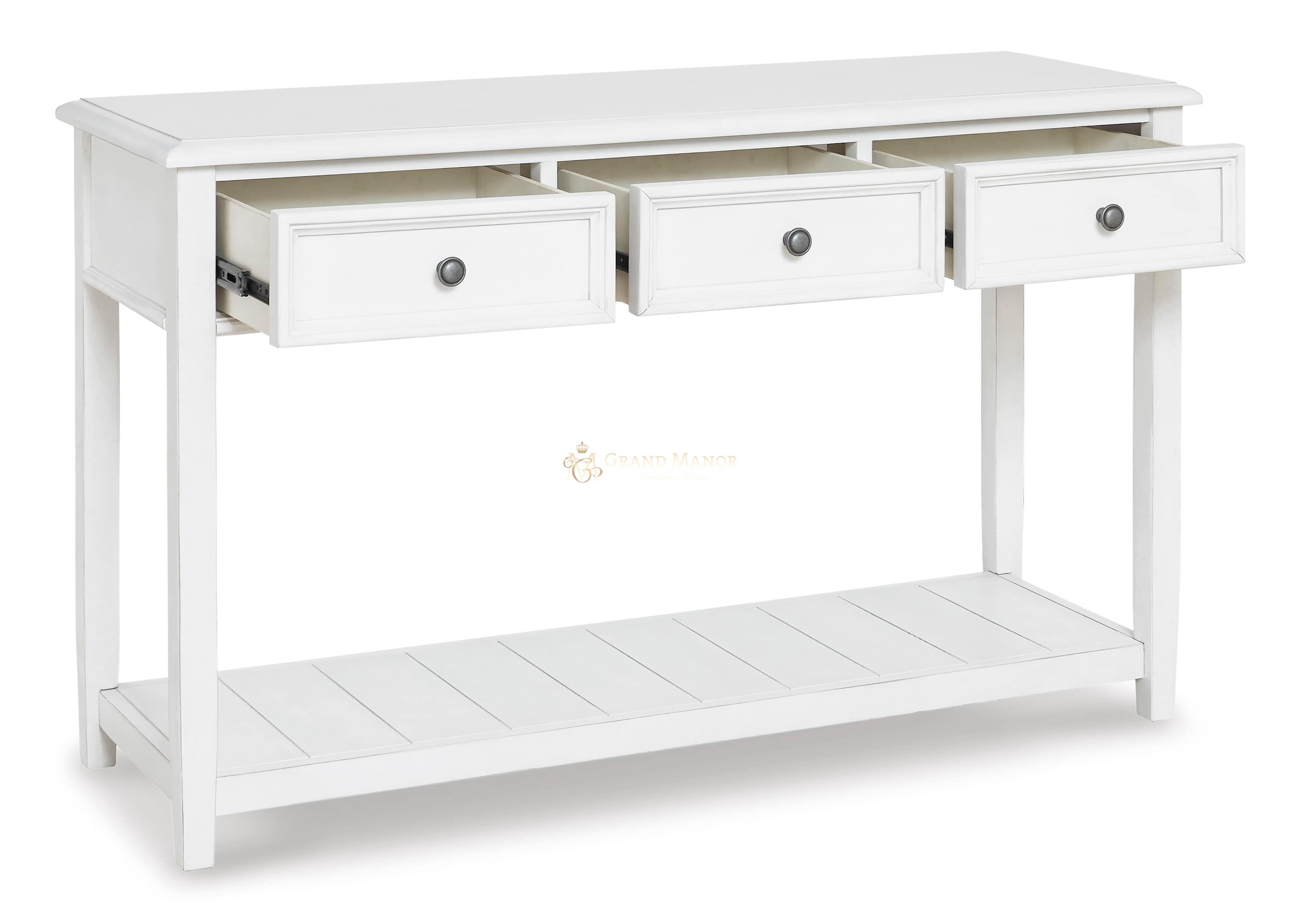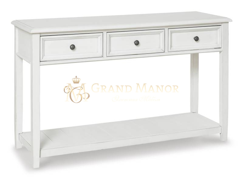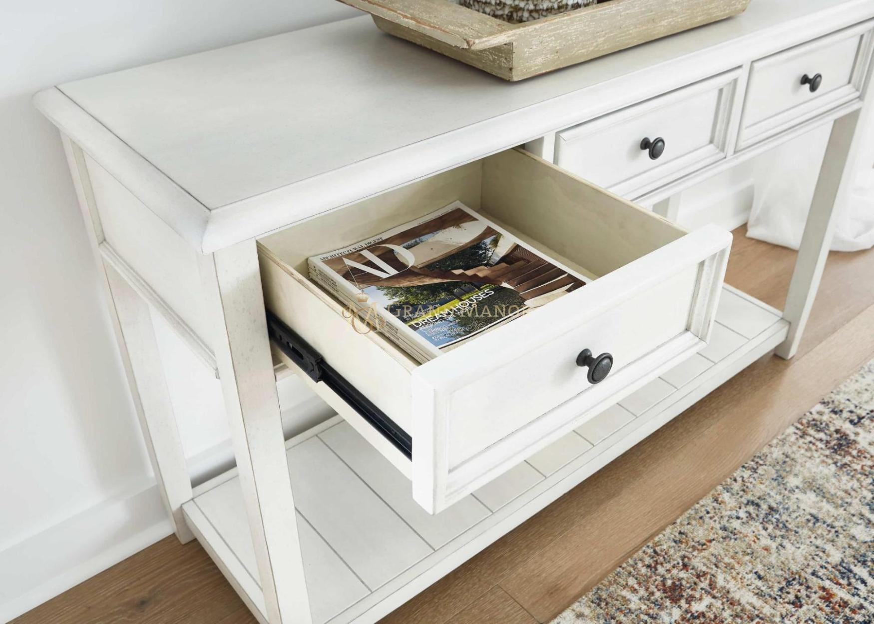 Придайте своему дому винтажный шарм и ценное место для хранения вещей с помощью этого потрясающего диванного столика. Три ящика и вместительная витрина с красивой потертой выбеленной отделкой помогут вам держать под рукой все необходимое в повседневном стиле.