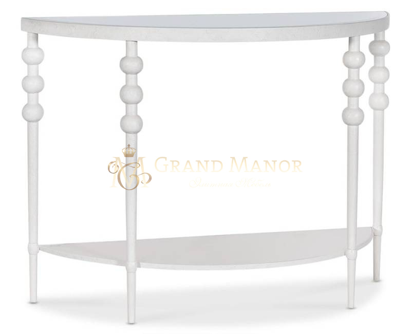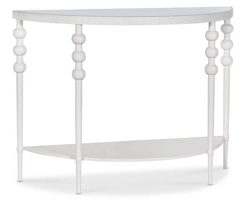Этот консольный столик в форме полумесяца отличается мягкой изысканностью благодаря белой текстурированной отделке и столешнице из белого стекла. Одна нижняя полка повышает его практичность, а форма в виде полумесяца делает его идеальным для узких помещений.