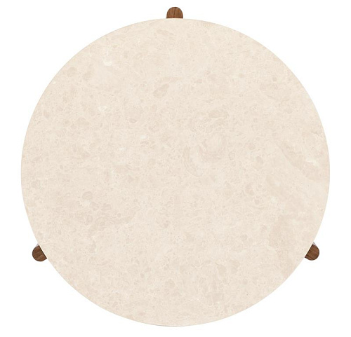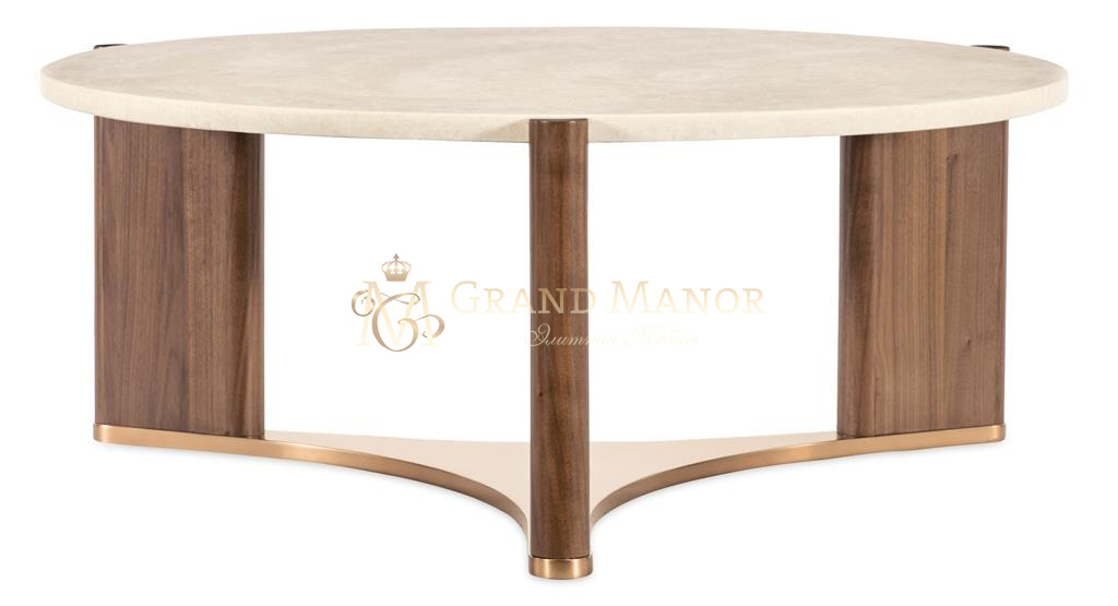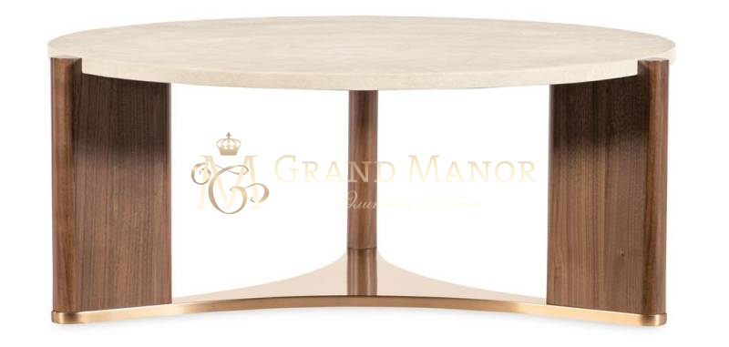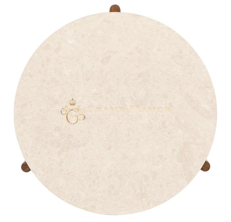 Круглый коктейльный столик Eleana - это изысканное центральное украшение со столешницей из шлифованного мрамора в белых и бежевых тонах, идеально дополненное светло-карамельным шпоном орехового дерева и металлической подставкой из бронзы, освещенными солнцем.