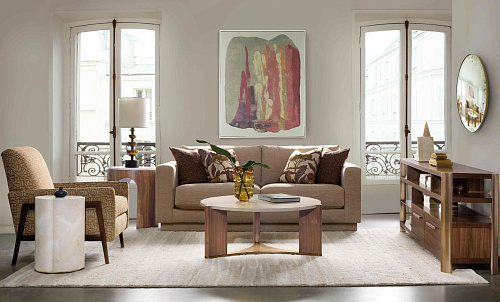 Его круглая форма и треугольный дизайн пьедестала создают ощущение скульптурного равновесия и изысканности, что идеально подходит для гостиных переходного периода, которые ценят как красоту, так и функциональность.
