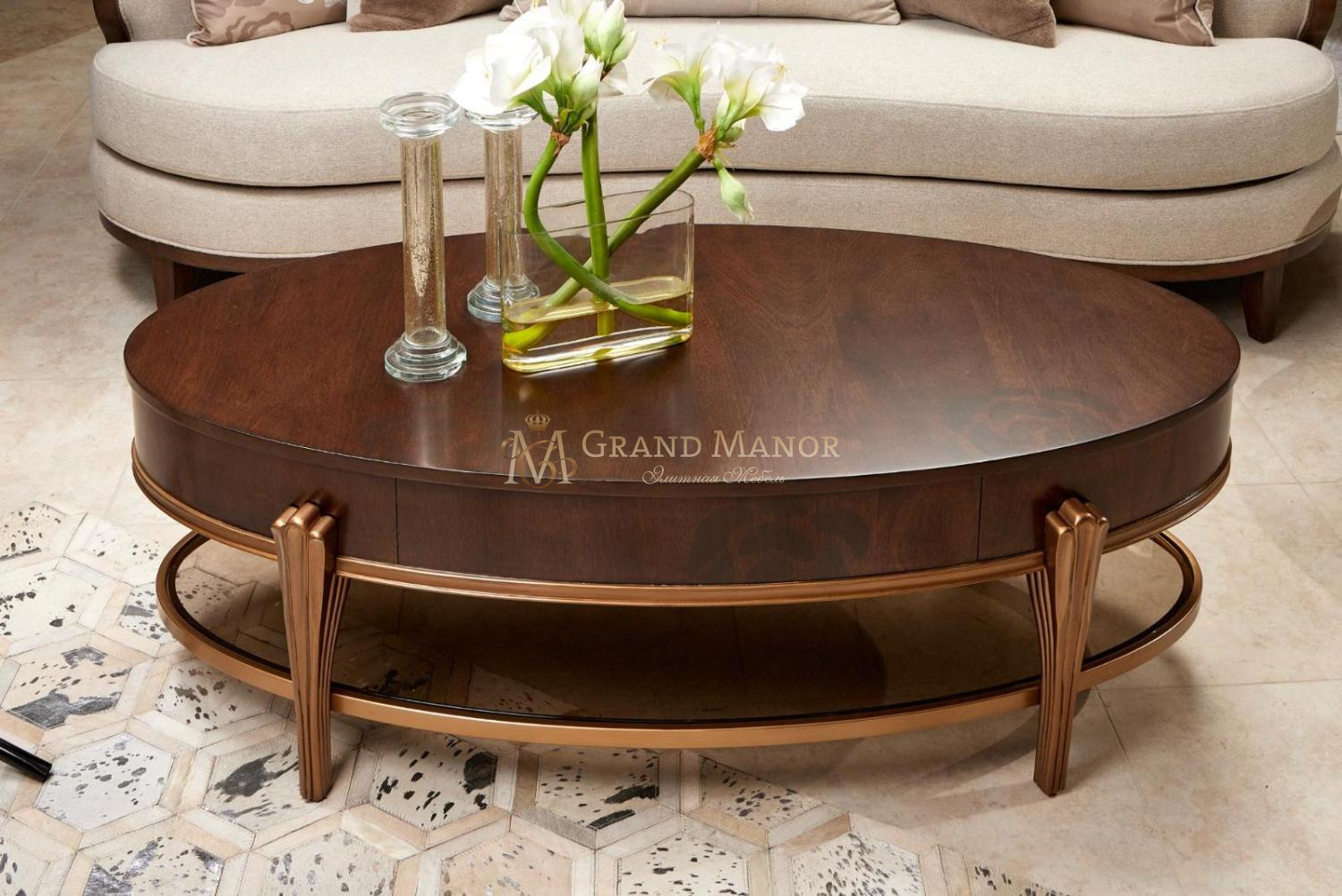 Объединитесь вокруг этого предмета, который обязательно станет центром внимания. Коктейльный столик Camellia Field объединяет изысканный дизайн и функциональность. Столешница из шпона красного дерева с ореховой отделкой и золотыми акцентами выглядит тепло и роскошно. Выдвижной ящик с бархатной обивкой и фирменной ручкой в виде камелии обеспечивает удобное хранение. Нижняя полка из тонированного стекла добавляет столику современный штрих.