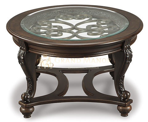 - Изготовлен из шпона, дерева и искусственной древесины с акцентами из литой смолы и стеклянной столешницей.