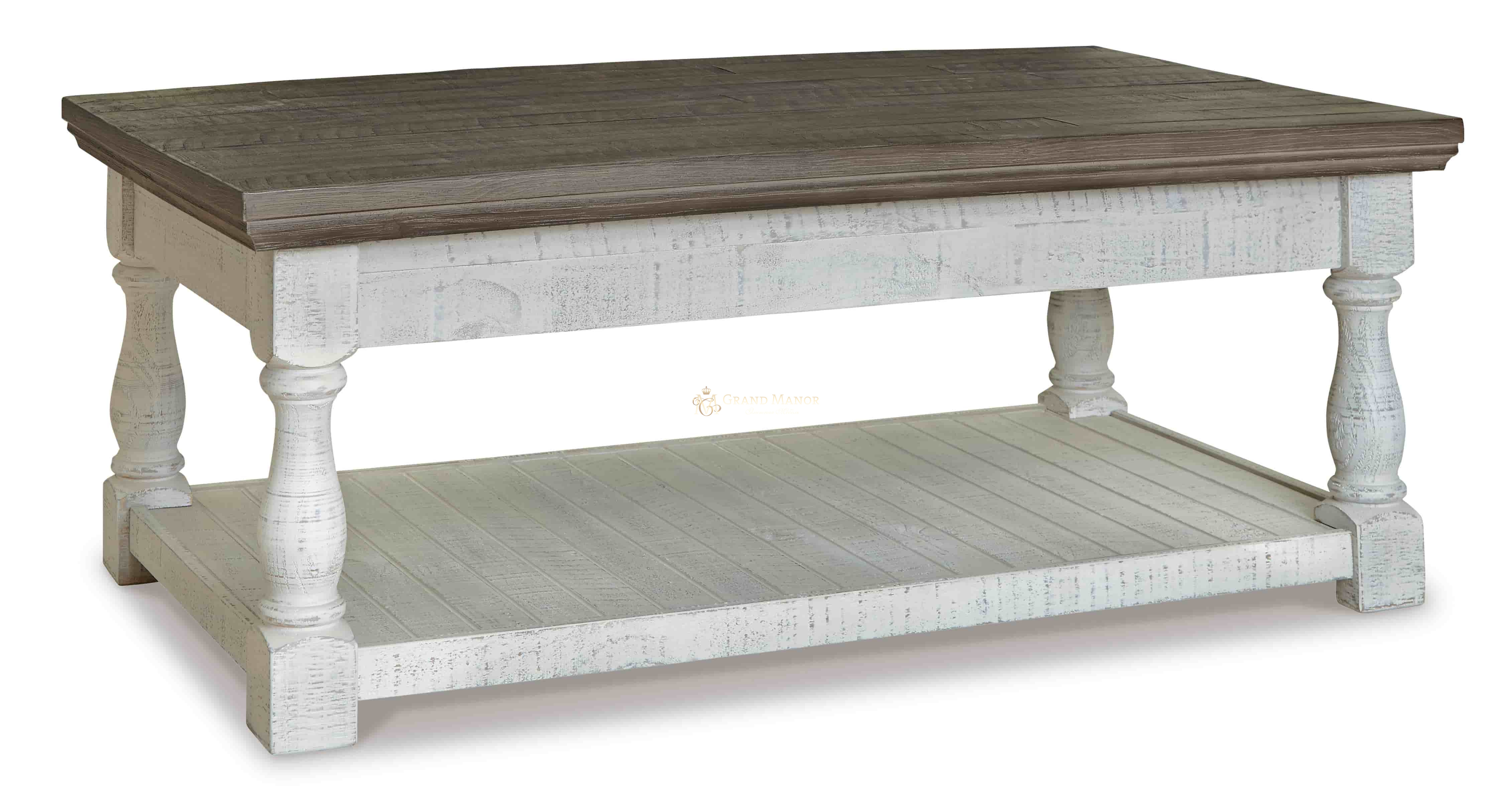 Этот журнальный столик с подъемной столешницей, богатой отделкой в деревенском стиле и сочетанием текстур, напоминает город былой красоты. Его двухцветная отделка с потертостями сочетает в себе состаренный серый цвет с винтажным белым, создавая совершенно очаровательный эффект.
