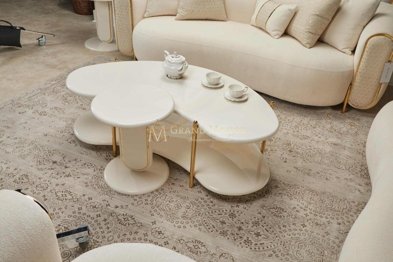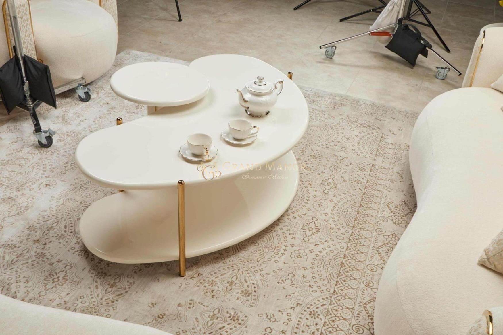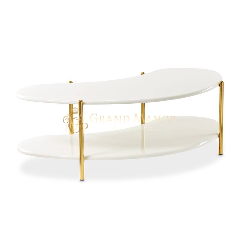 Двухъярусный коктейльный столик Sassani, представляющий собой поразительное сочетание современного дизайна и безупречной элегантности, покрыт роскошным жемчужно-белым лаком. Мягкие, органичные формы ярусов дополняются тонкими ножками из золотистого металла, придающими им нотку современной изысканности.